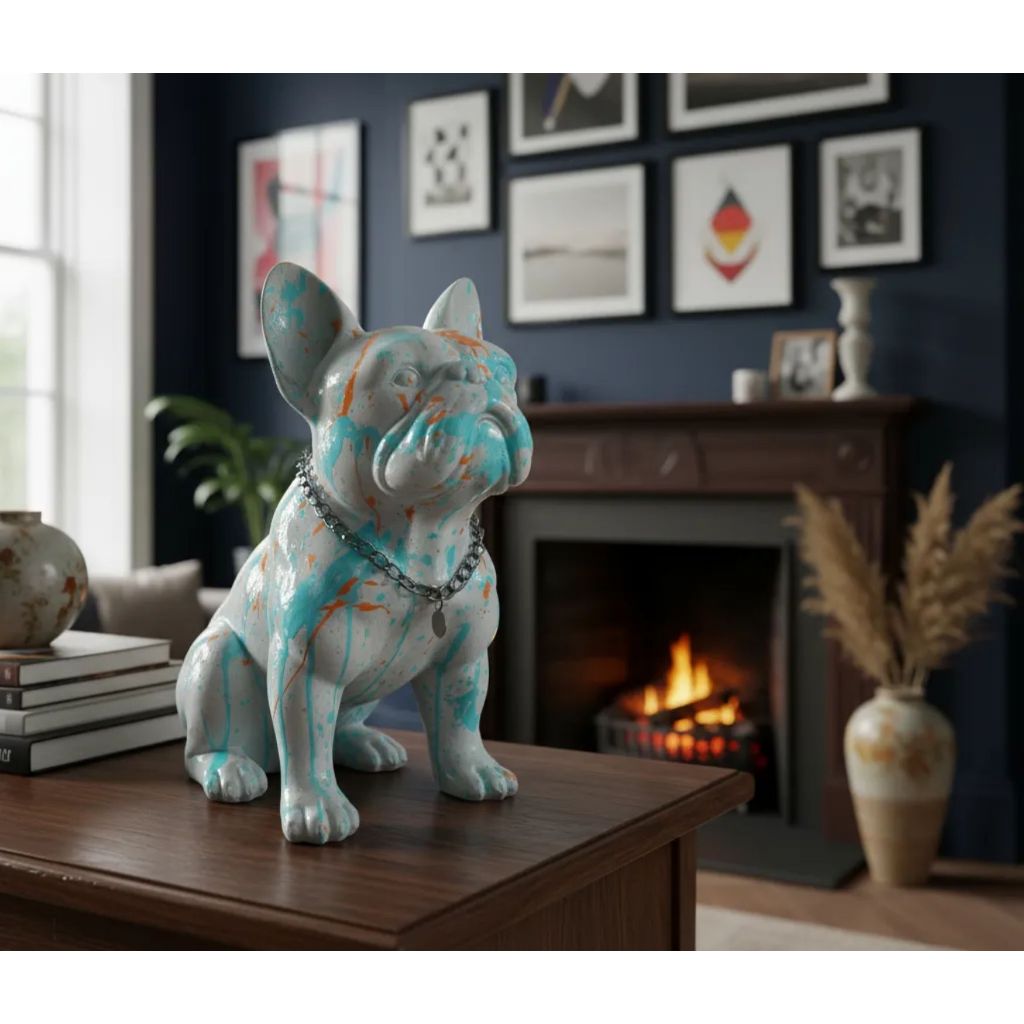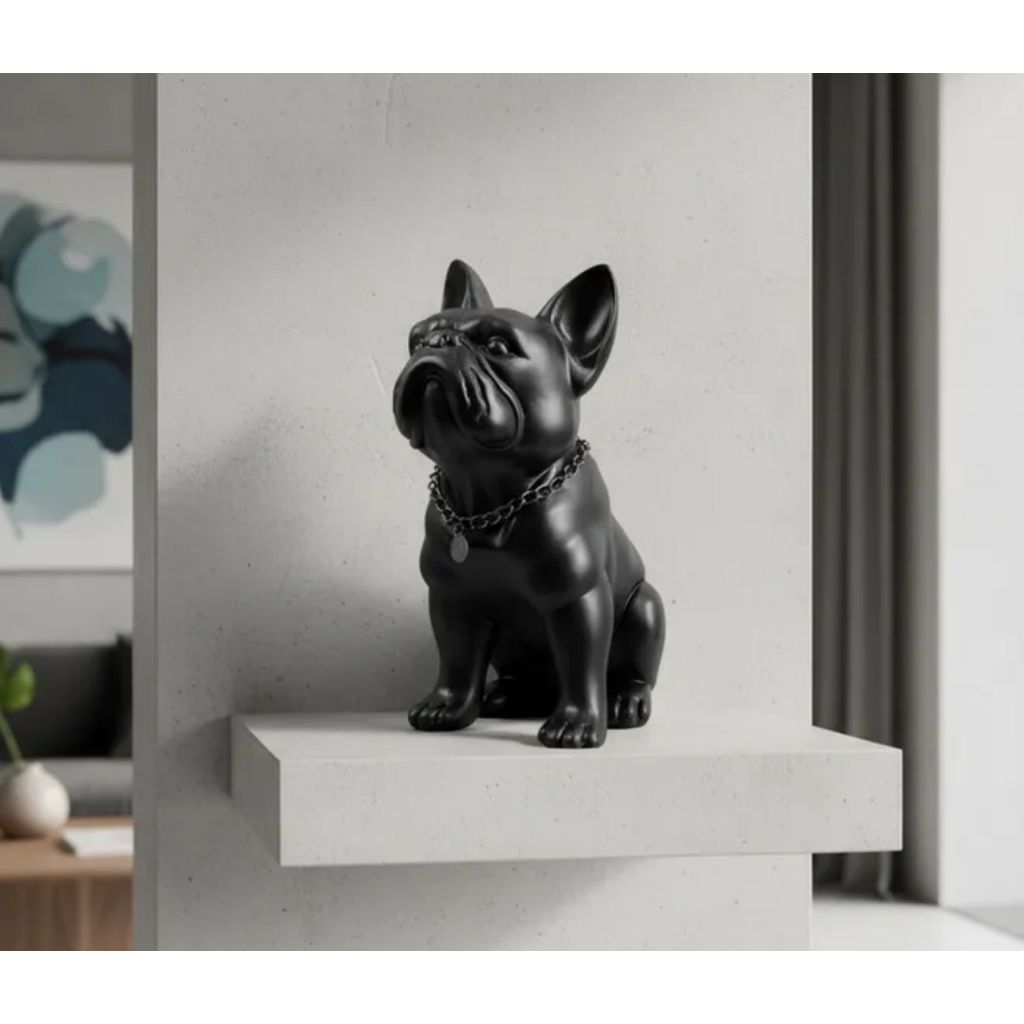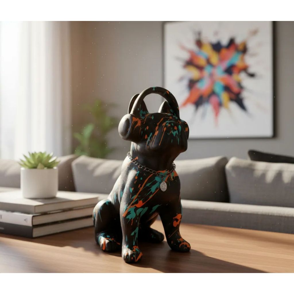 Estatueta cachorro Buldogue Francês com fone cor Preto Splach decoração casa sala quarto escritório
