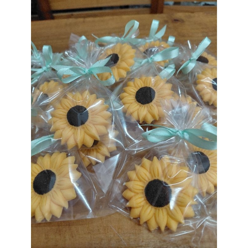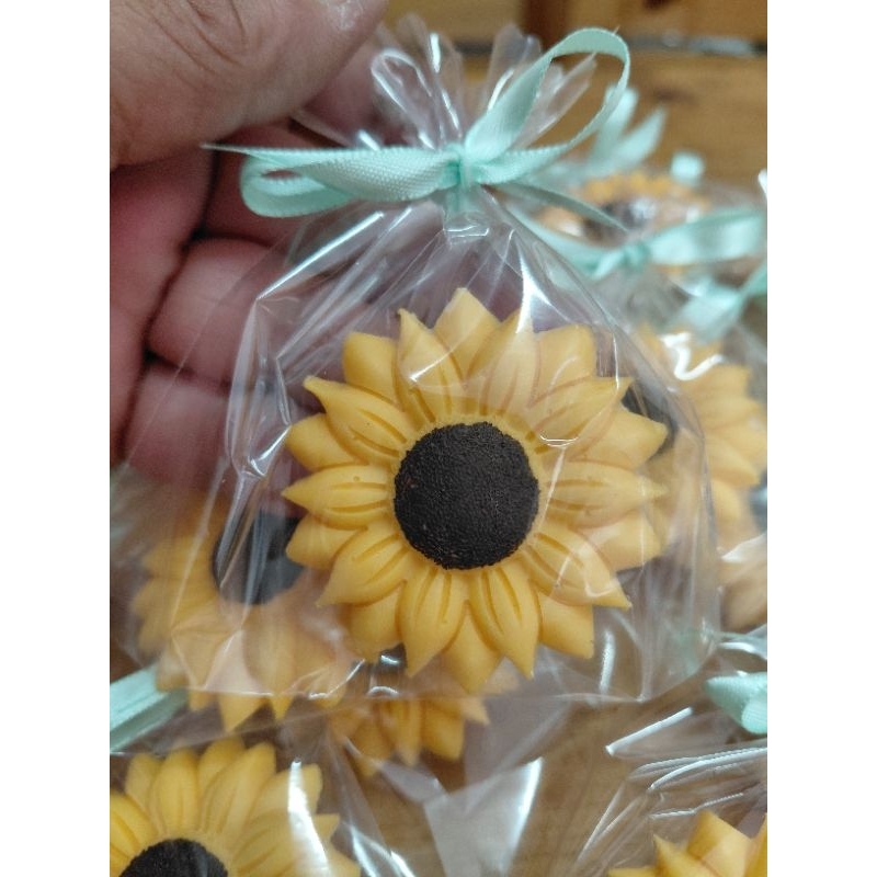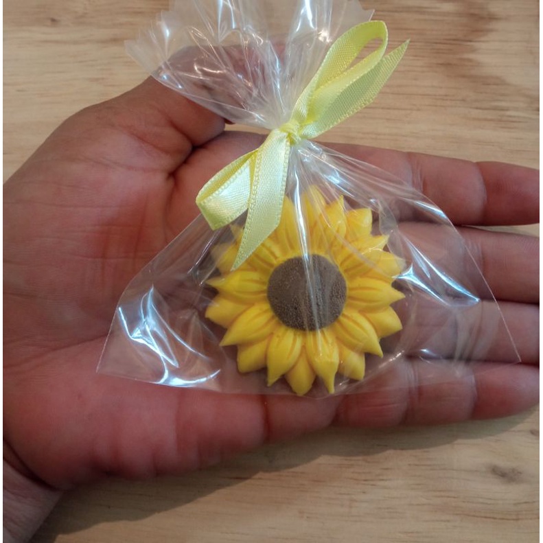 Kit com 70 Mini sabonetes em formato de girassol lembrancinhas aroma lavanda