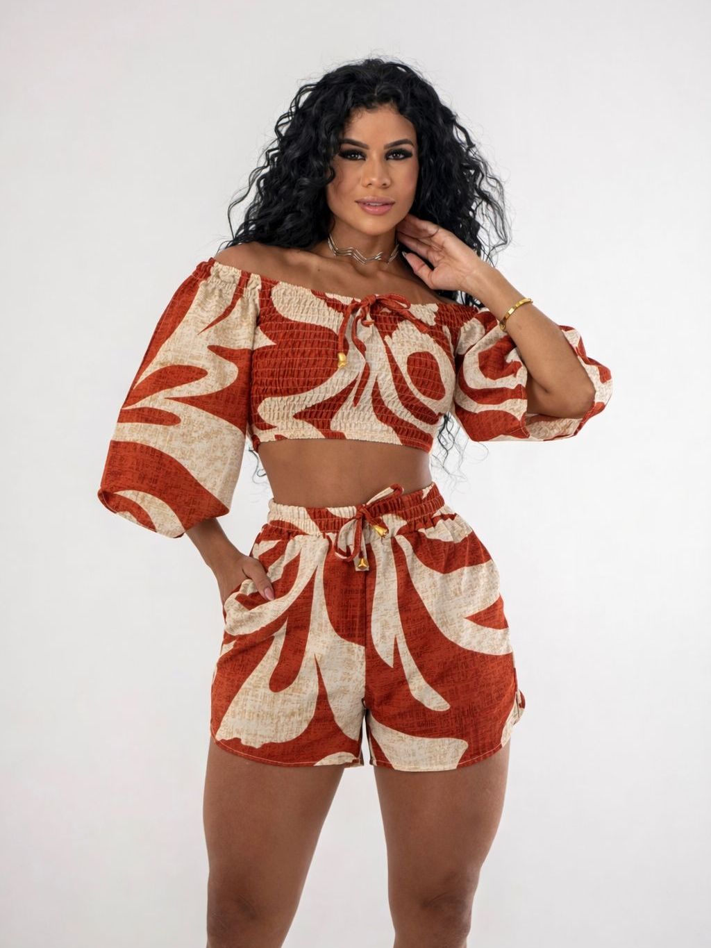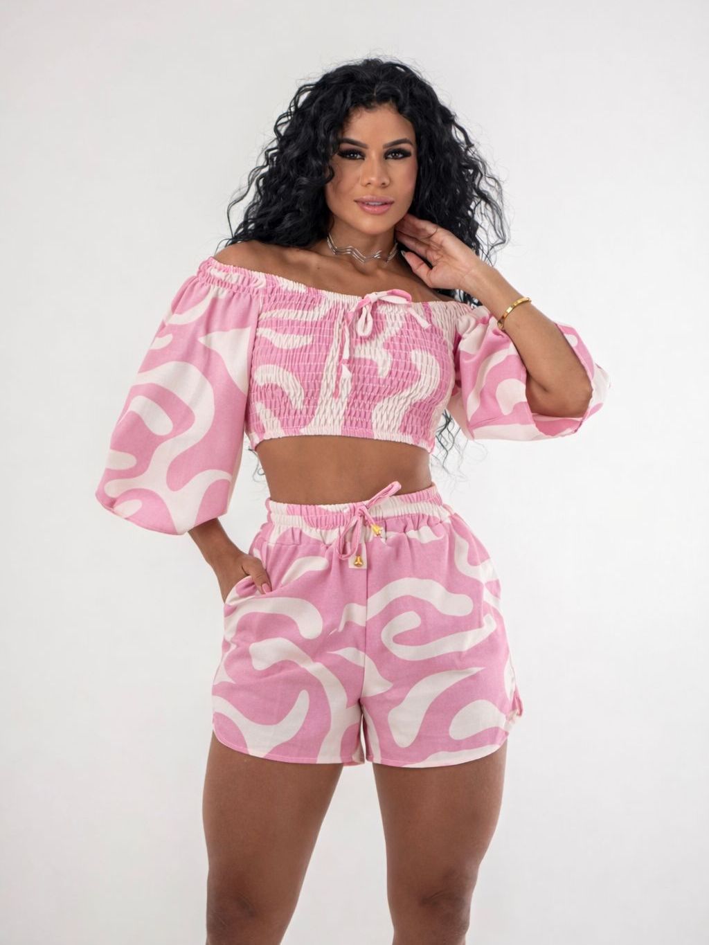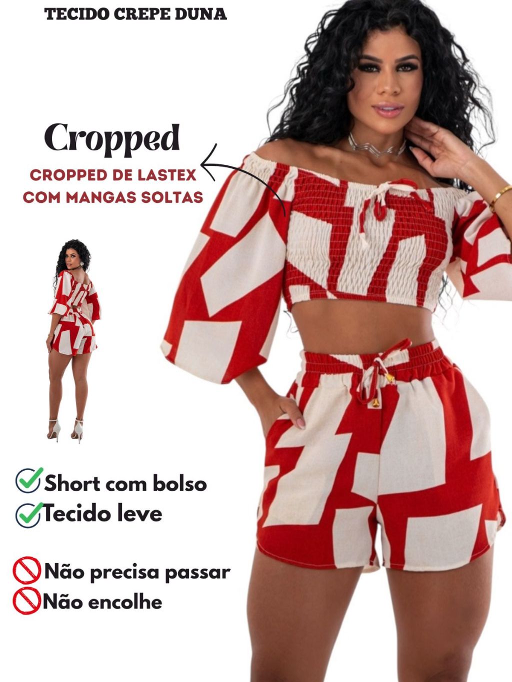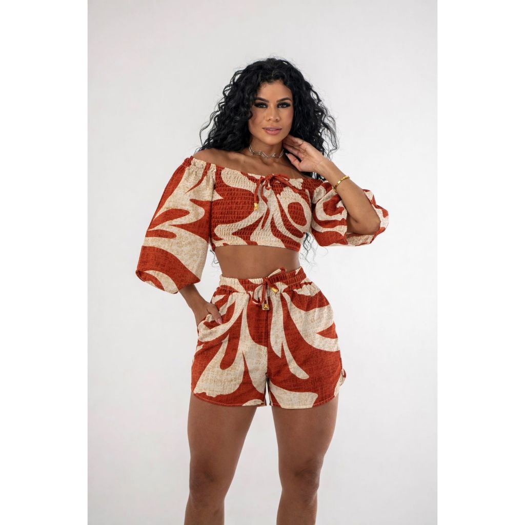 Conjunto Estampado Feminino Cropped Lastex Com Short Duna Estiloso Verão Com Manga Confortável