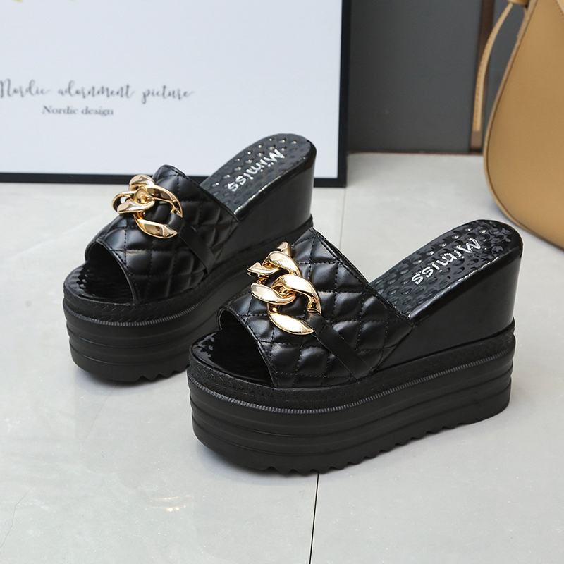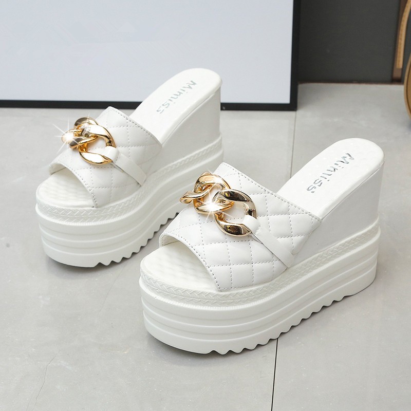 Moda Feminina Saltos Em Cunha 12 cm Lindas Sandálias Com Plataforma De Corrente De Ouro (Tamanho 34-39)