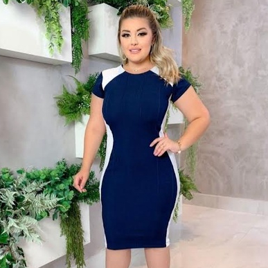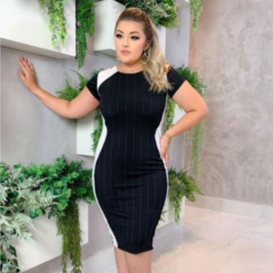 Vestido Midi Tecido Canelado Tubinho Com Manga Lycra e Faixas Brancas na Lateral
