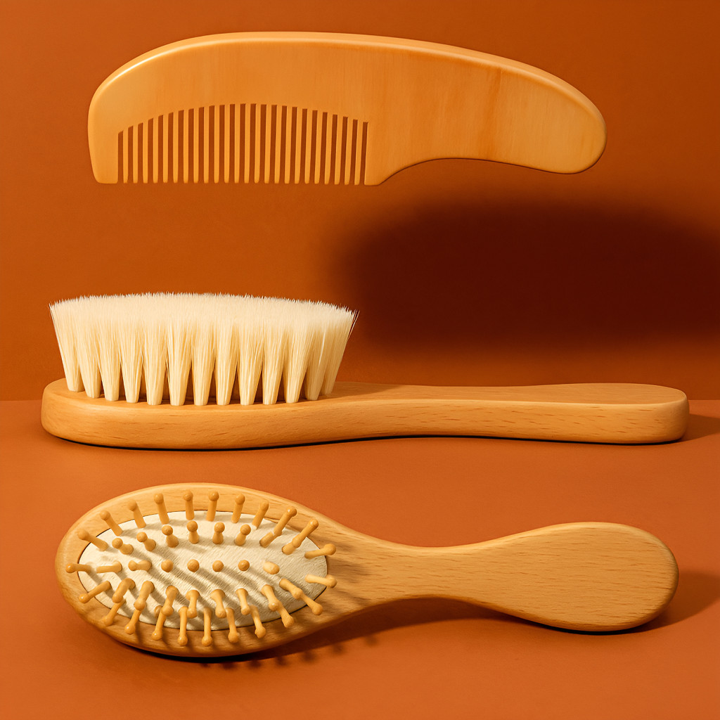 Kit 3x Escovas e Pente Infantil Bebê Bambu Cerdas Macias Minizen Minimalista