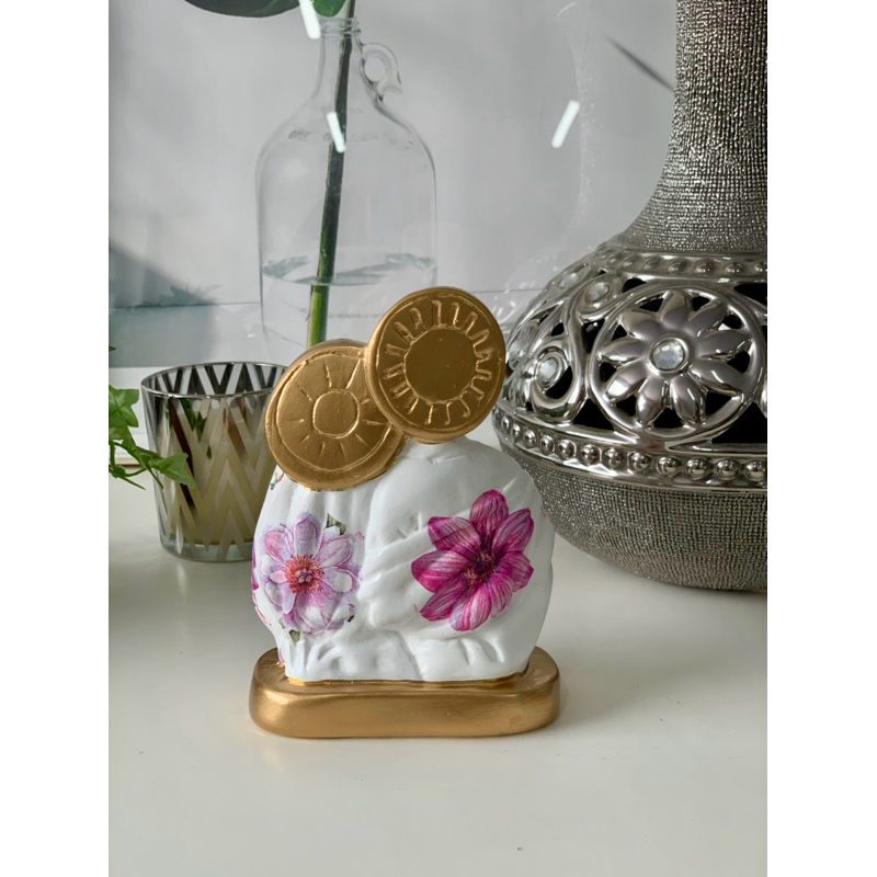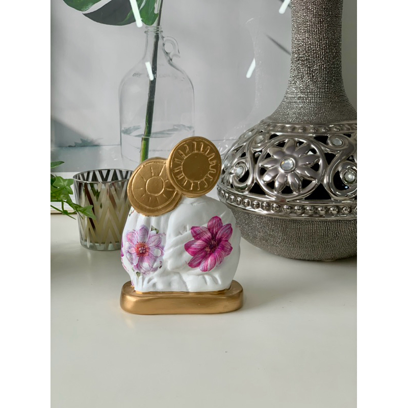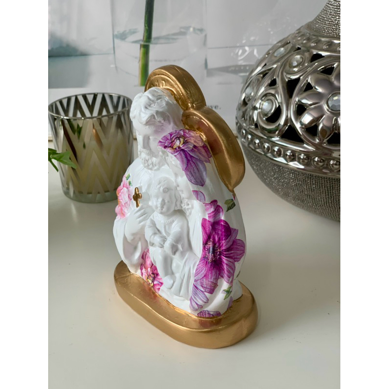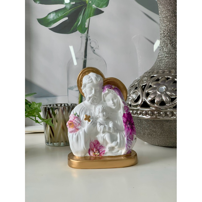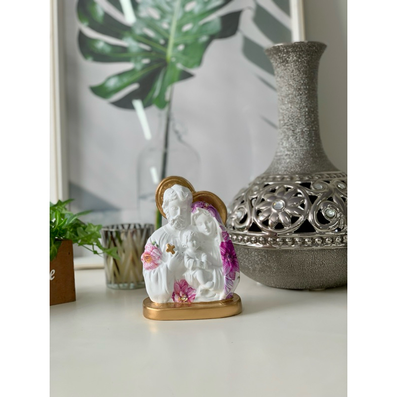 sagrada família 15 cm manto flor lilás dourado detalhes gesso