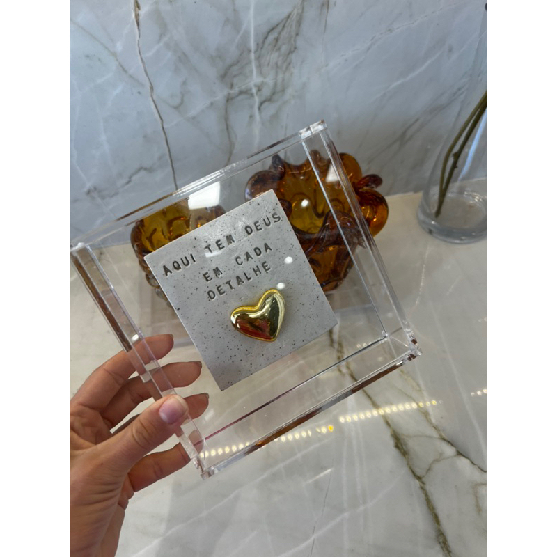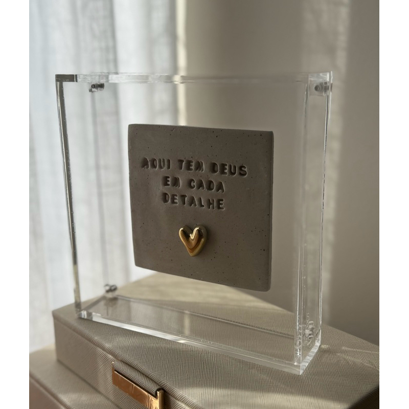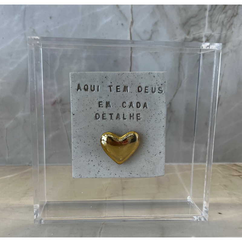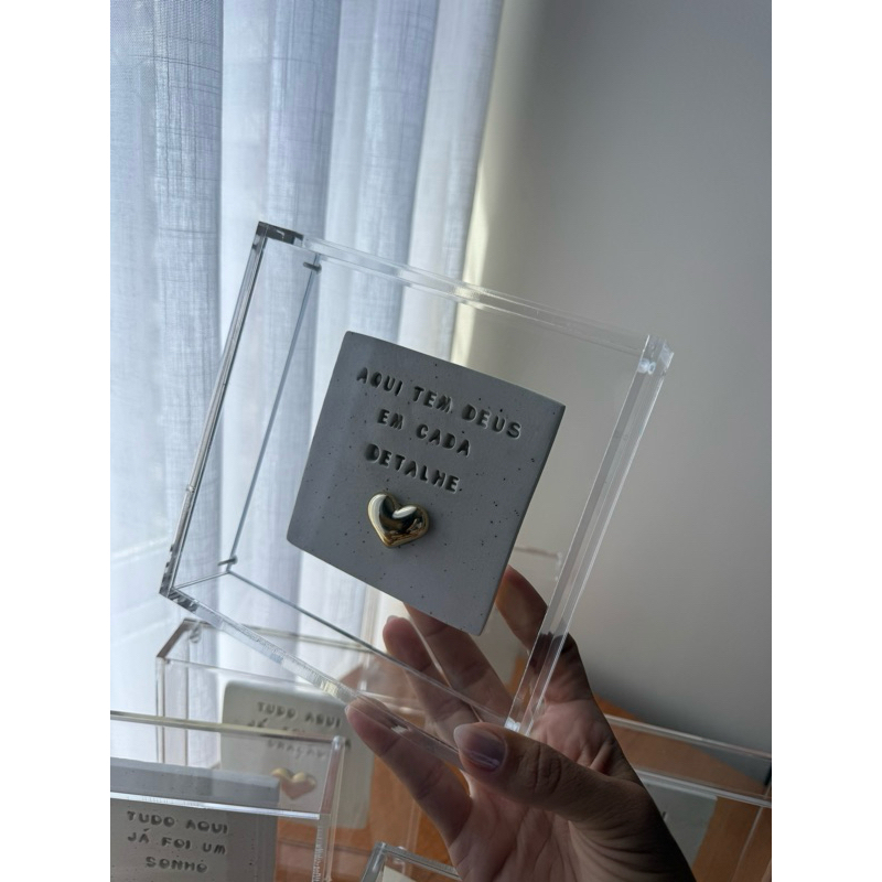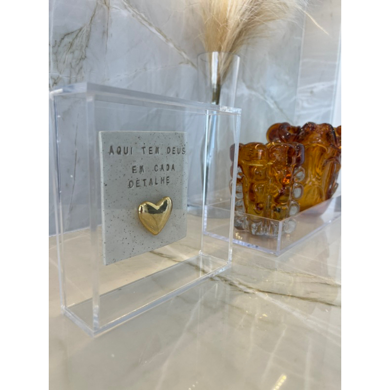 Quadro de Acrílico com placa de cerâmica “ Aqui tem Deus em cada detalhe ”. o modelo de coração pode variar