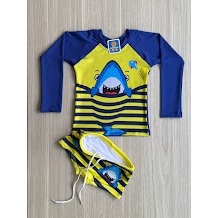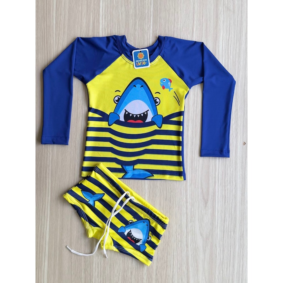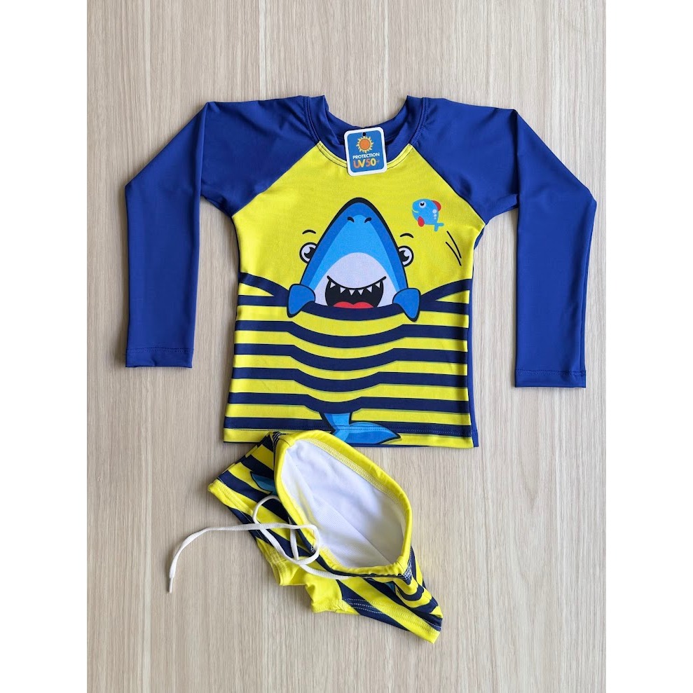 Kit Banho Conjunto Infantil Moda Praia Menino Verão Blusa Camisa Proteção Solar Uv50+ Sunga Tubarão