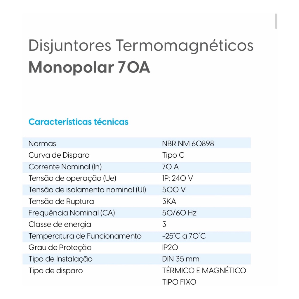 Disjuntor Monopolar Unipolar Elgin 70a Amperes