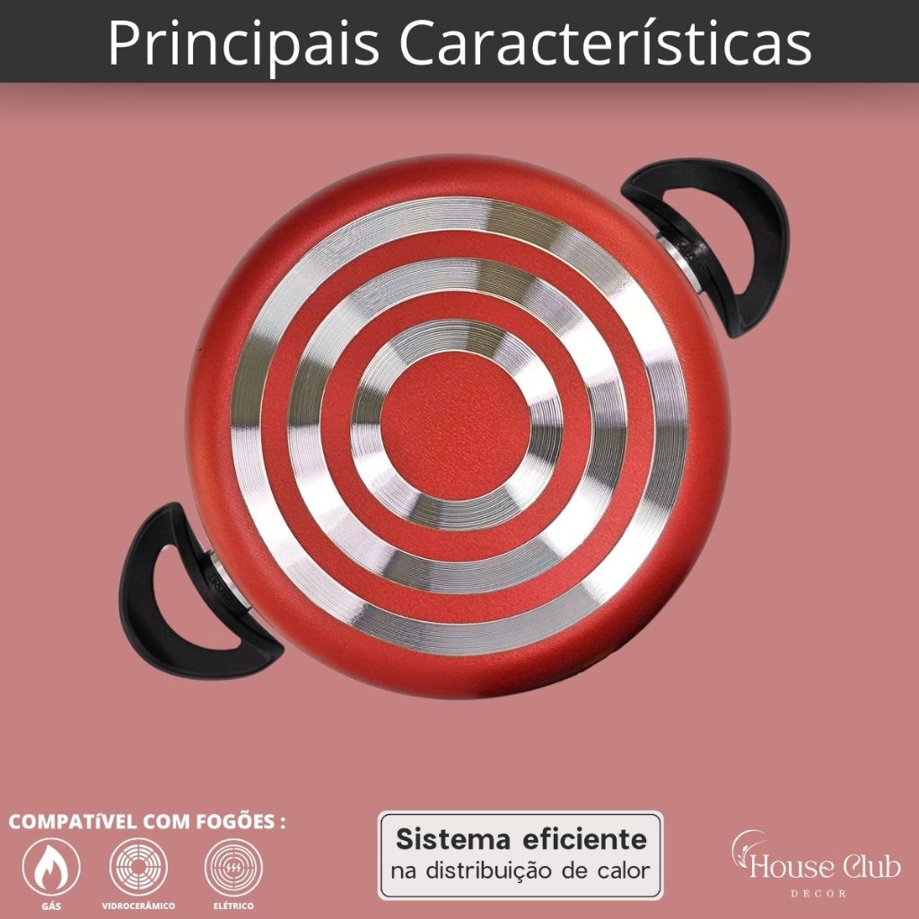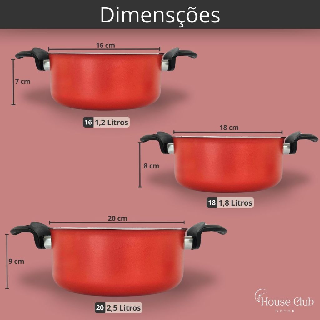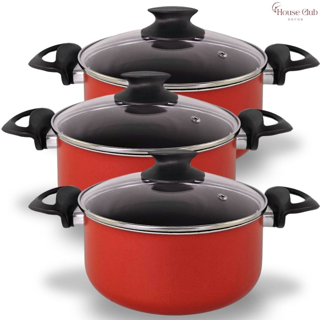 Kit 3 Peças Panelas Caçarolas 16, 18 e 20 cm Antiaderente 5 Camadas de Teflon com Tampa de Vidro Cor Vermelho e Grafite
