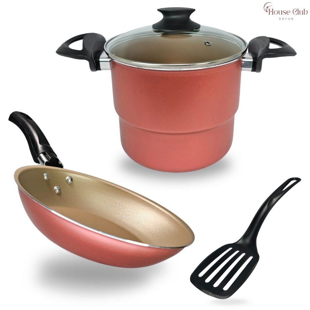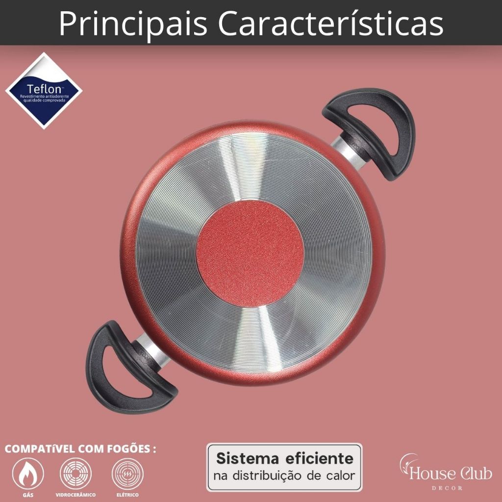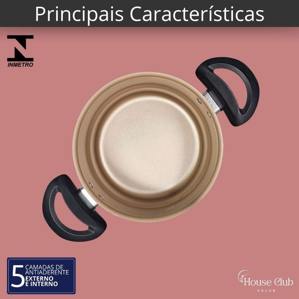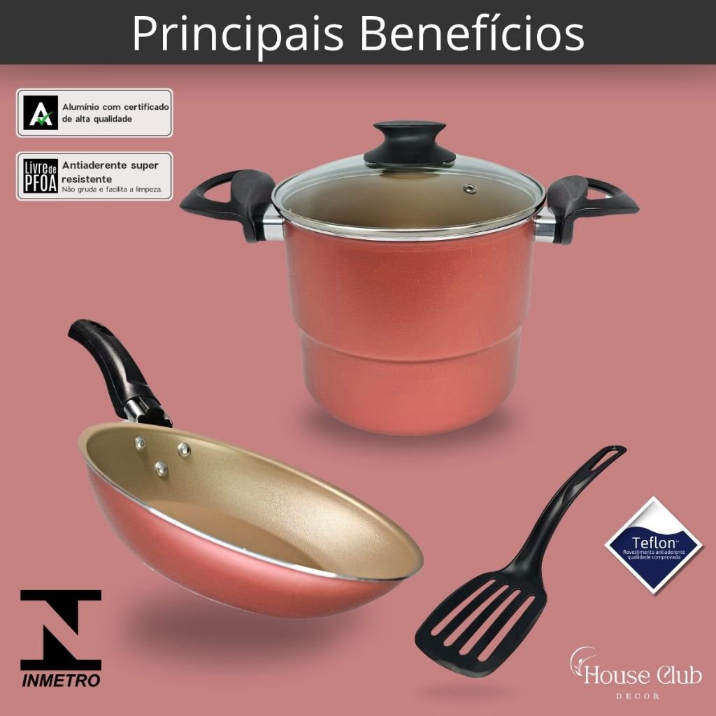 Kit Panela Cuscuzeiro 16 cm com e Frigideira Francesa 16 cm Antiaderente 5 Camadas De Teflon Cereja e Dourado