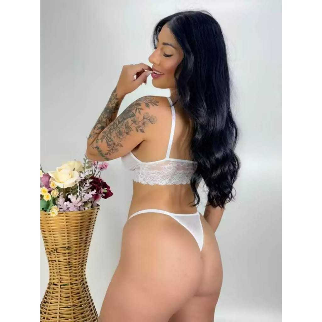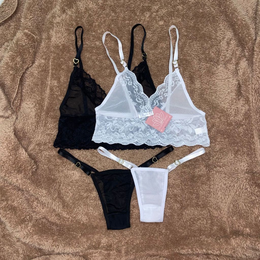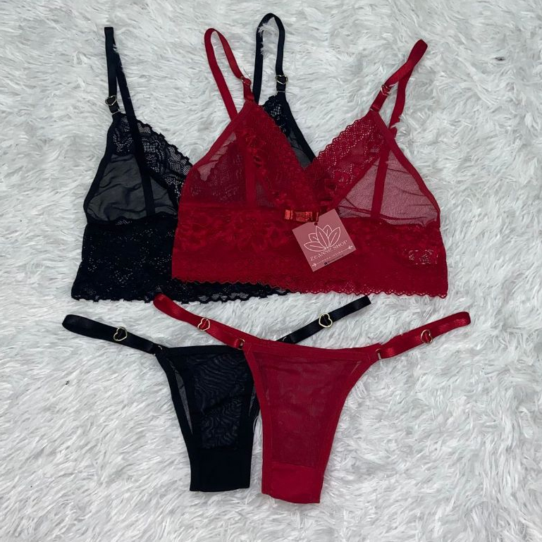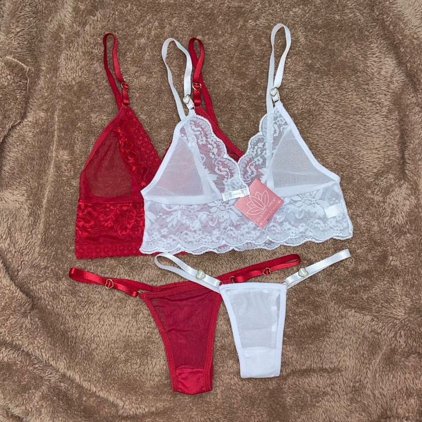 Kit 2 Conjunto de lingerie sexy de tule fio dental alça detalhe de coração delicada renda e tule