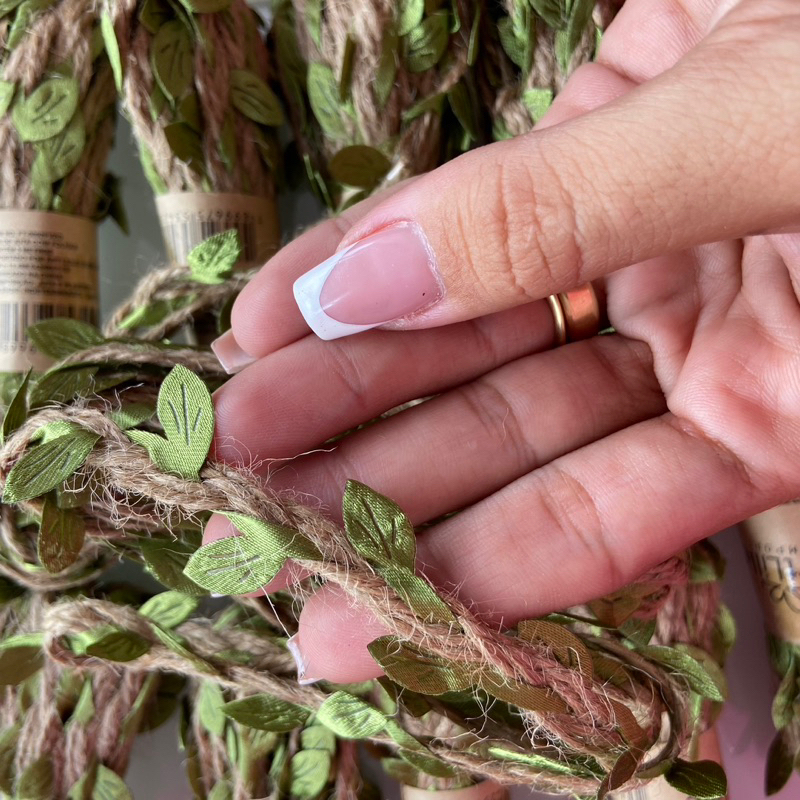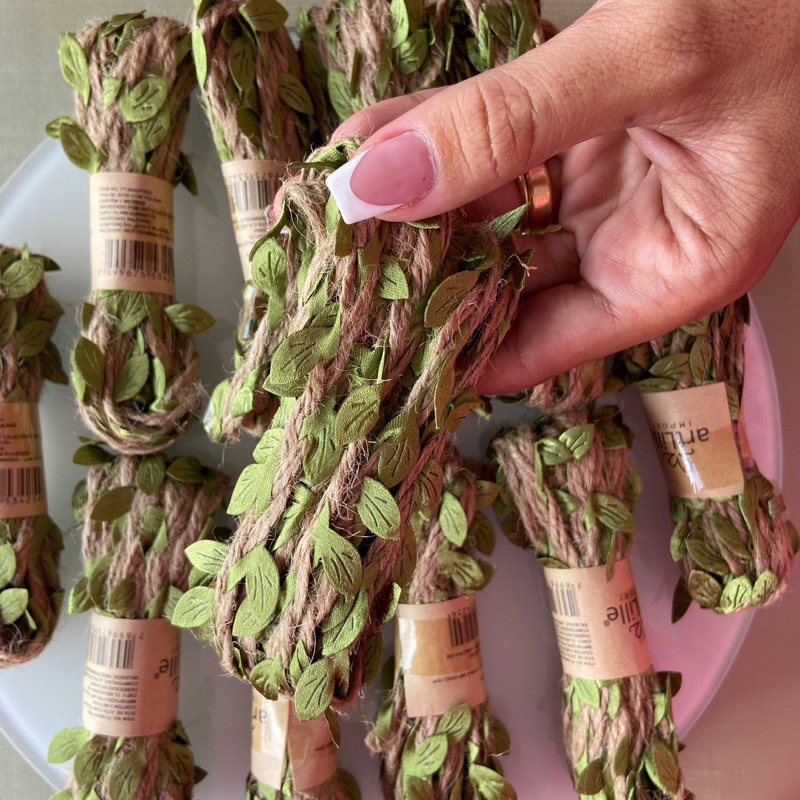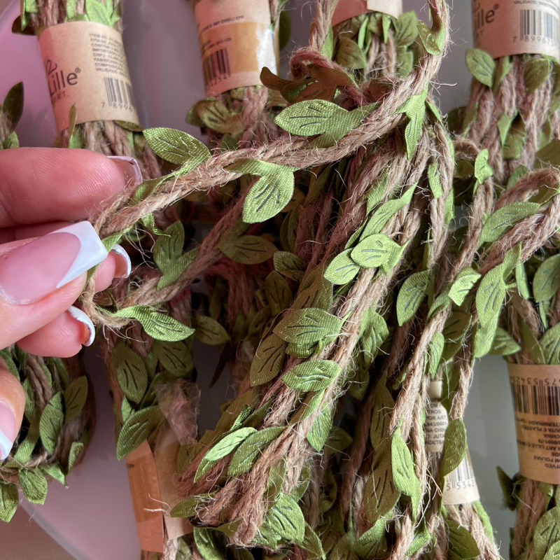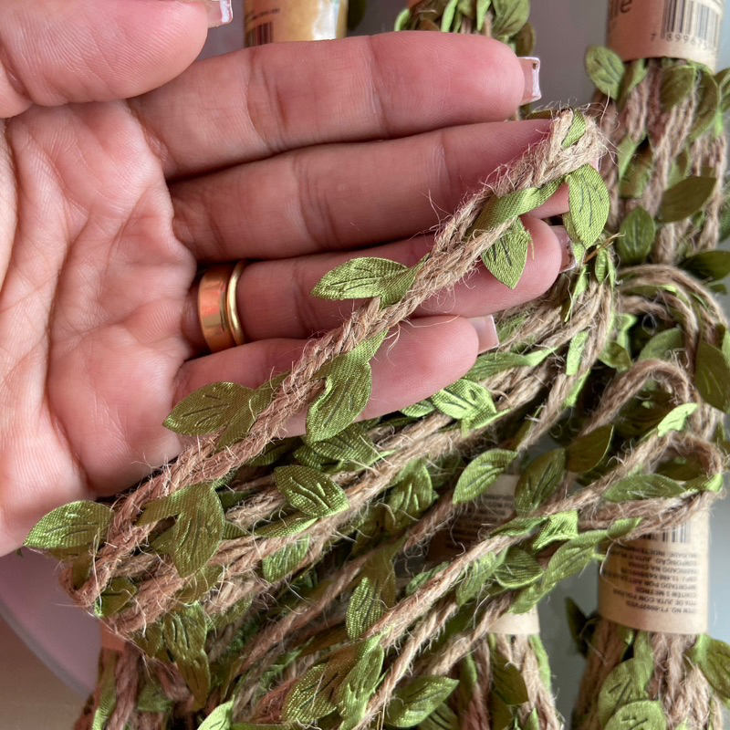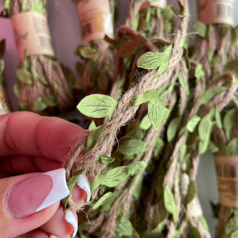 Fio Cordão Juta com Folhas Artificiais Seda Verde 3 Metros P/ Personalizados de Luxo