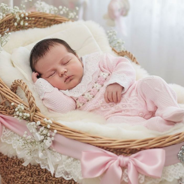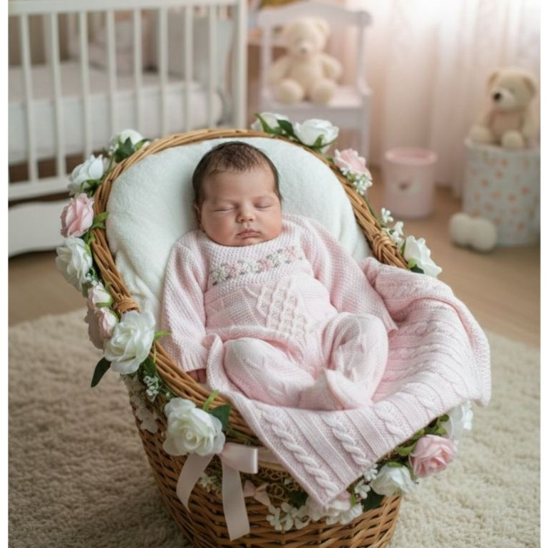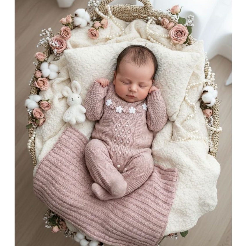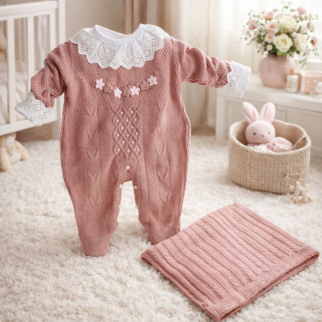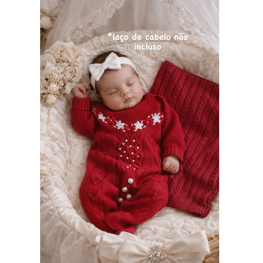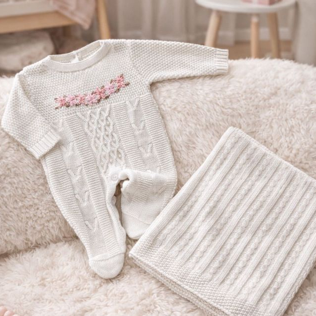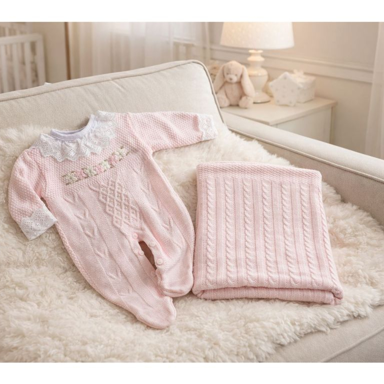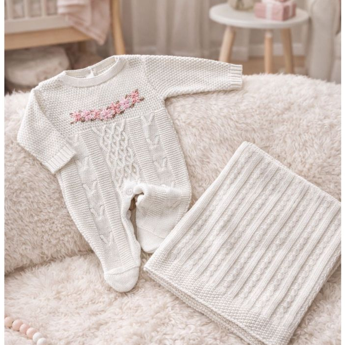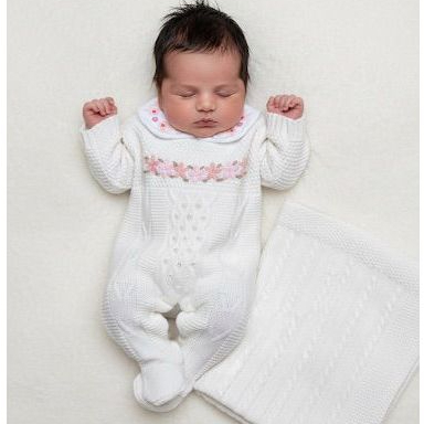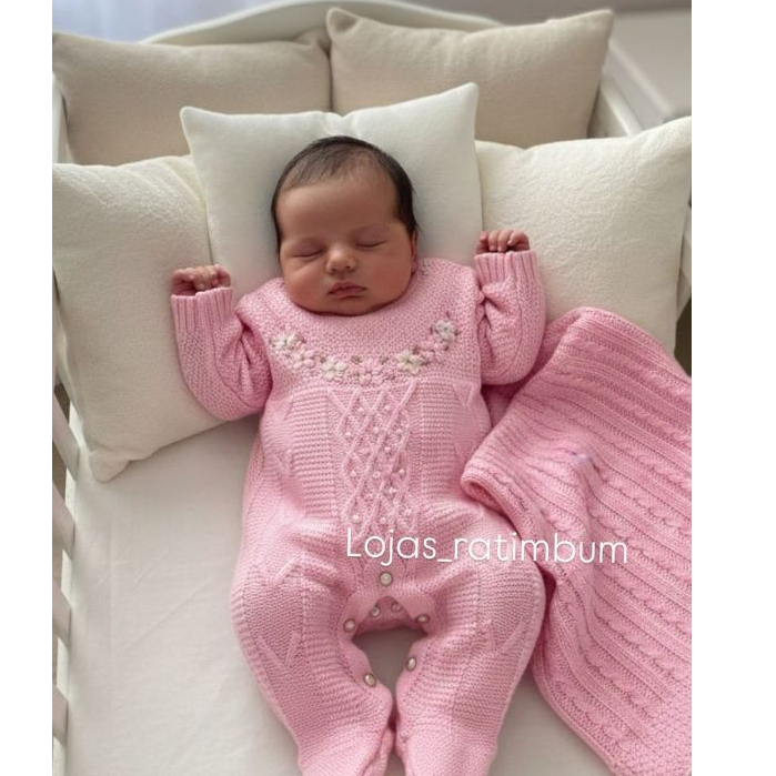 Saída de Maternidade Luxo Tricô Menina Macacão bordado e detalhes em pérolas e Manta trabalhada
