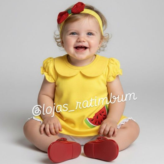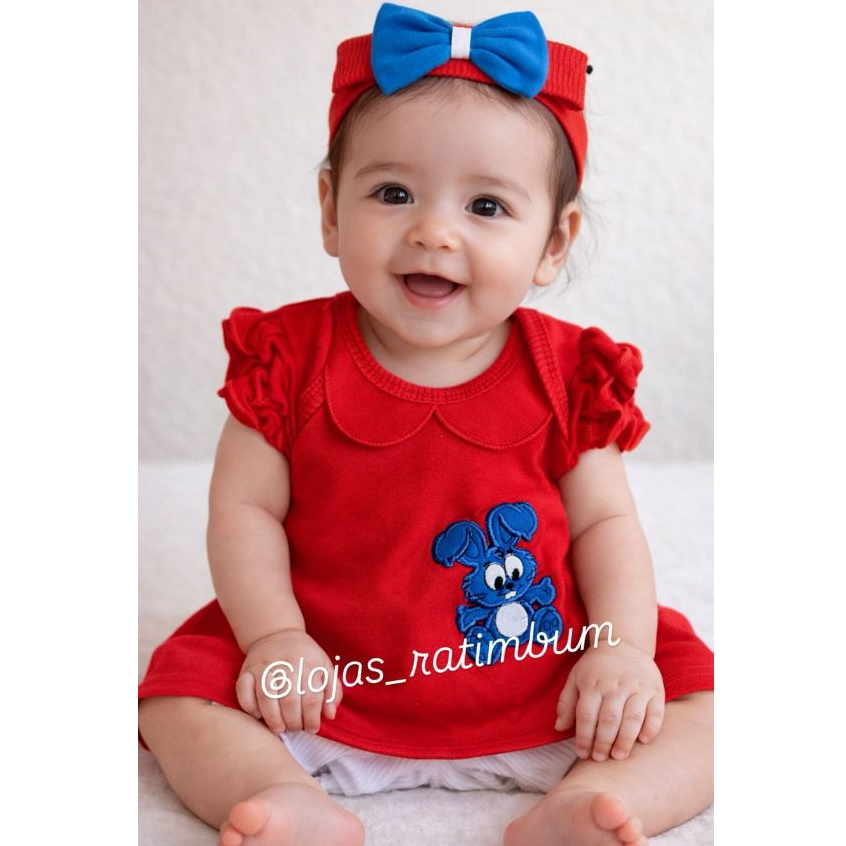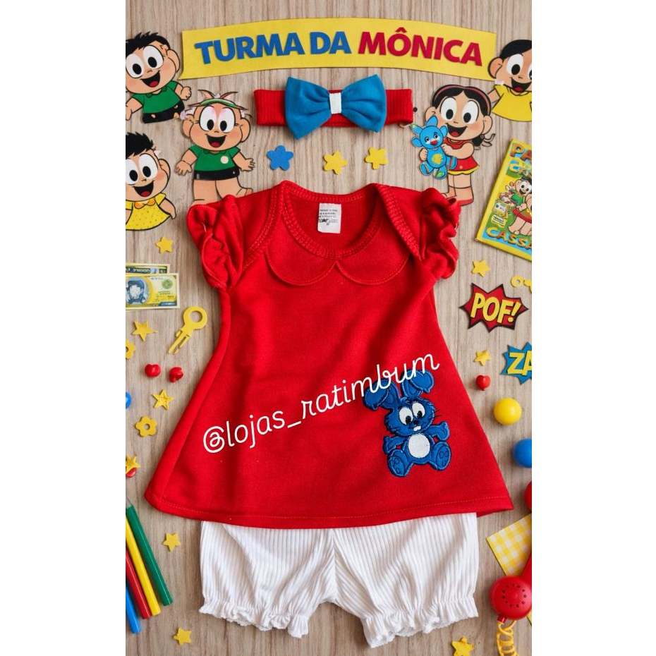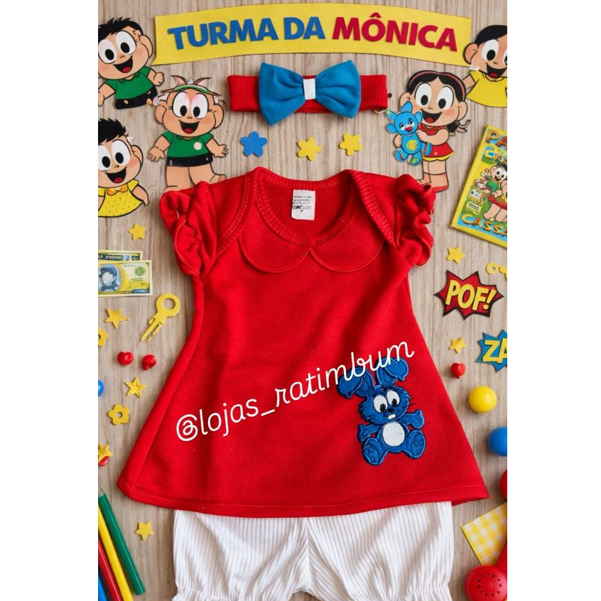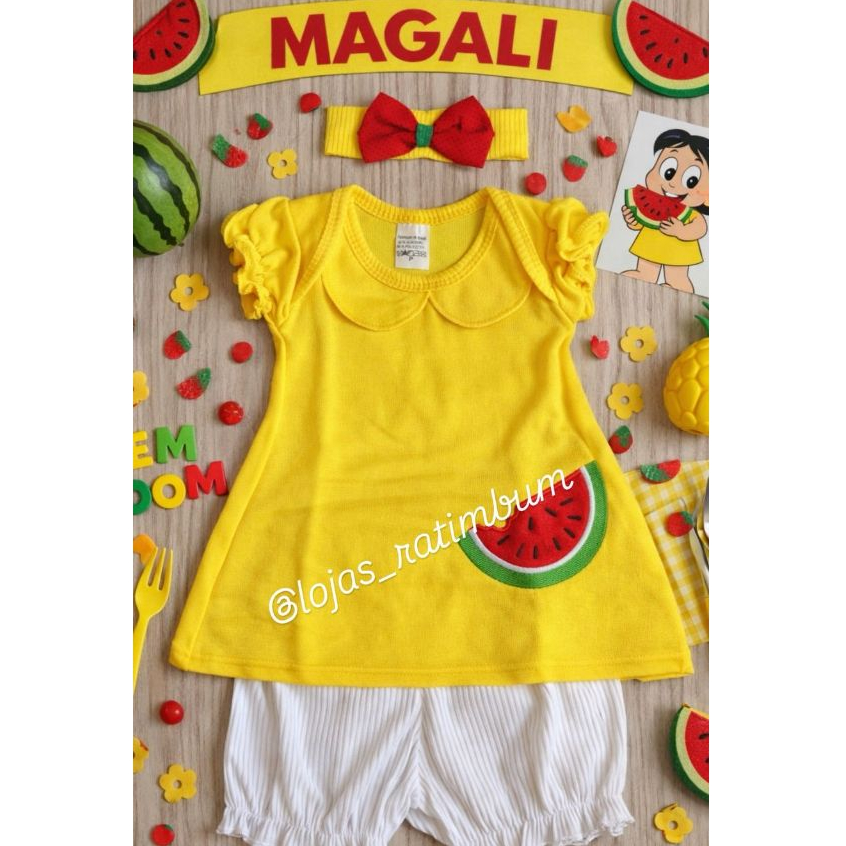 Fantasia Magali Infantil Bebê com Bordado Festa Mesversário 3pçs Bata, bermudinha e tiara