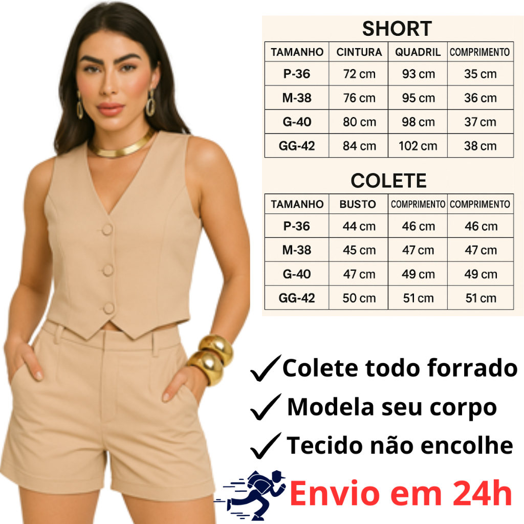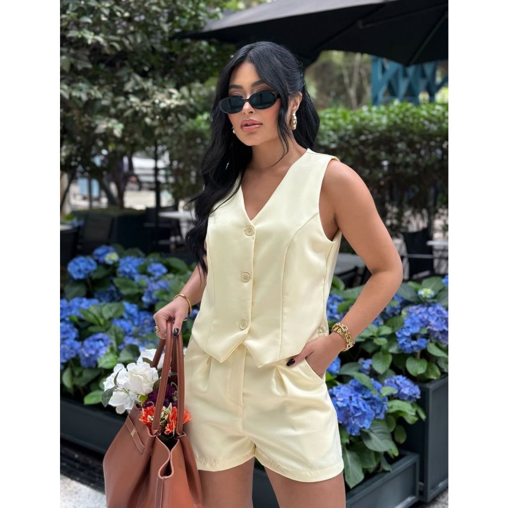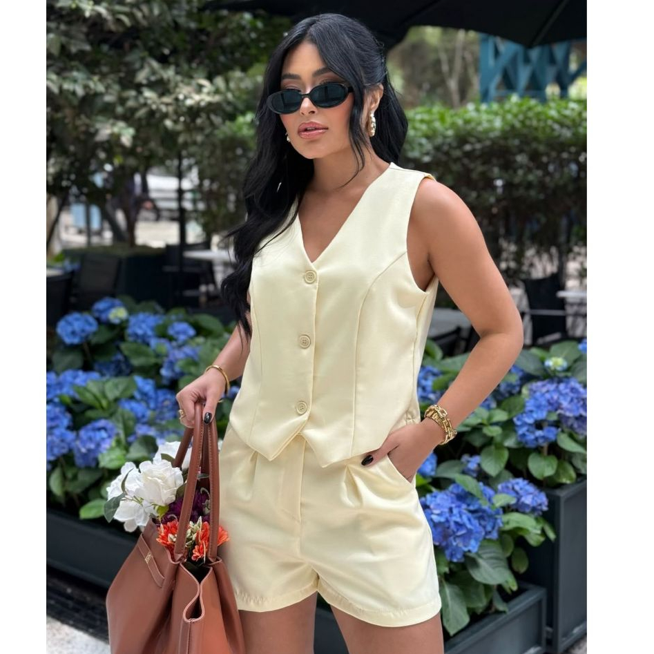 Conjunto Feminino Alfaiataria Colete e Short com Botões Forrados Bolso e Ziper Elegante Conforto