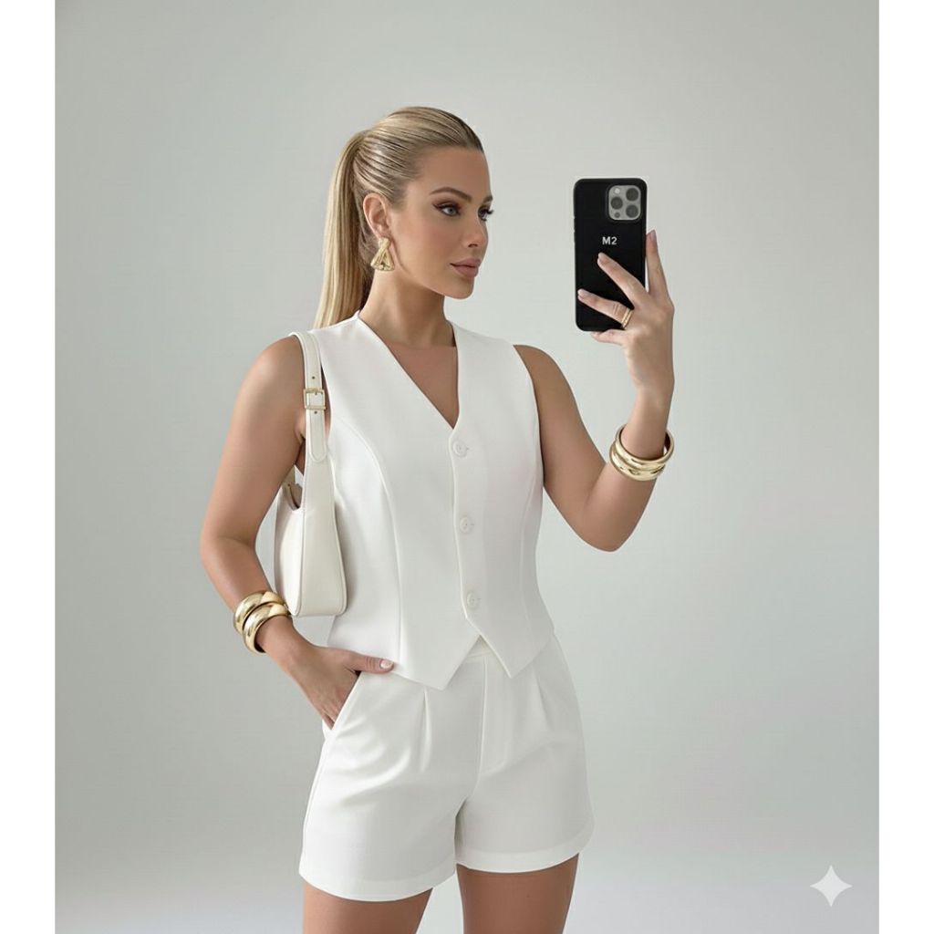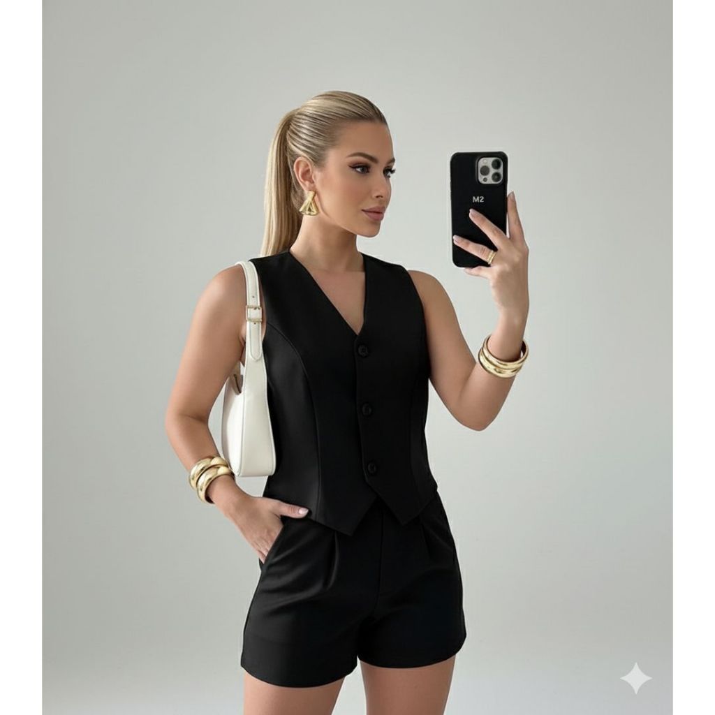 Conjunto Feminino em Alfaiataria Social Colete com 3 botões e Short com bolsos nas Laterais Versátil Moda Casual Verão