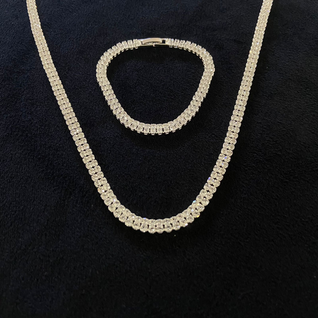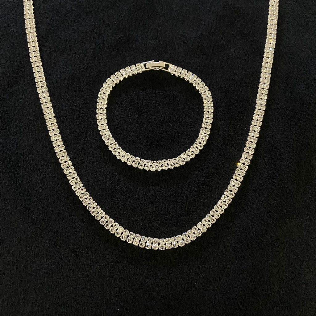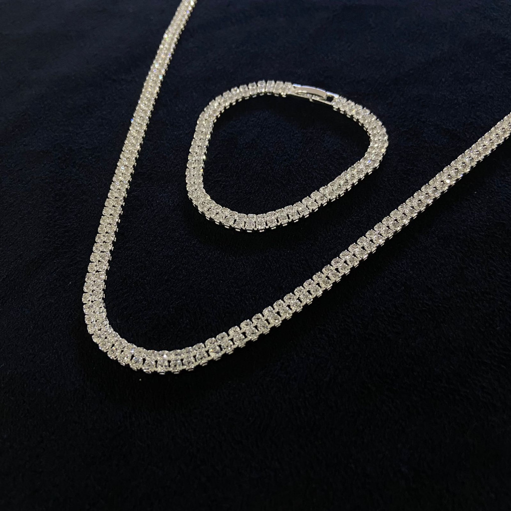 Kit Colar corrente ice cravejado Duas Voltas + Pulseira duas fileiras de pedras brilhantes Modelo Premium NJR 50cm