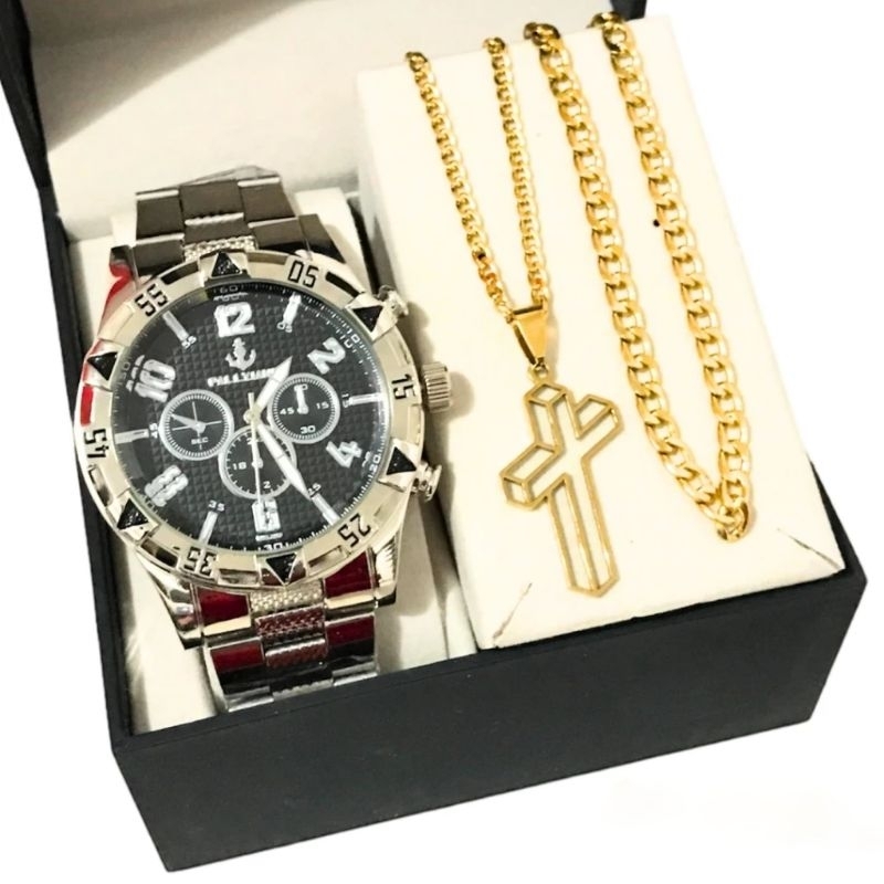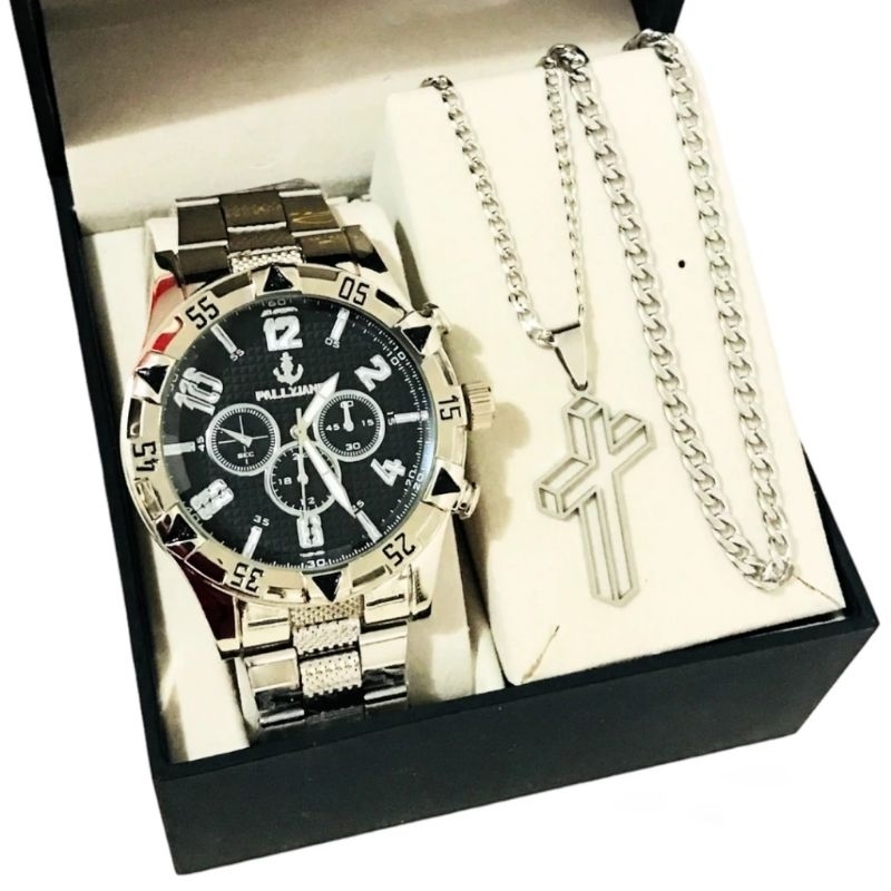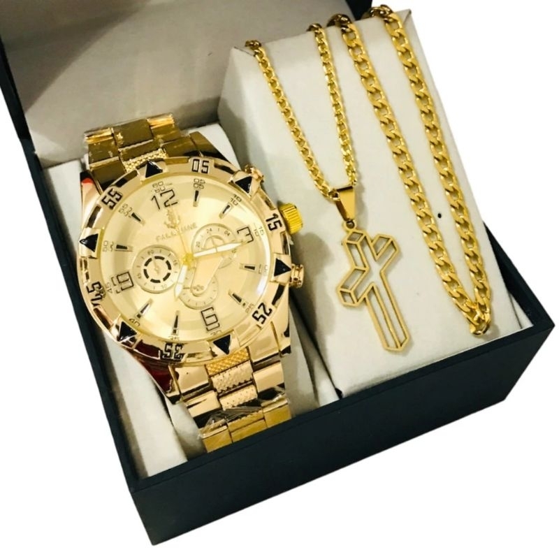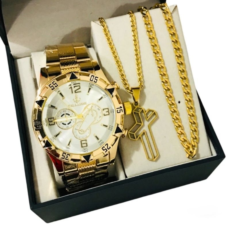 Conjunto Kit Masculino Pulseira Prata Dourada Banhada a Ouro 18k + Relógio Aço Inox Prata Original