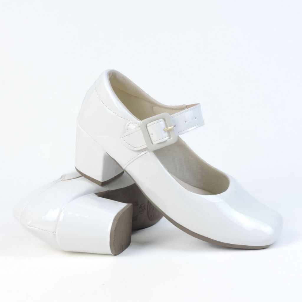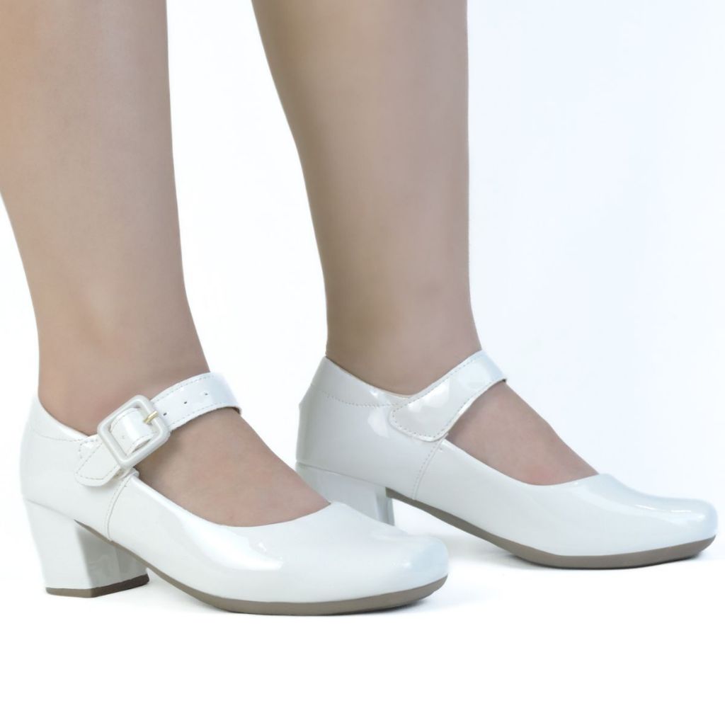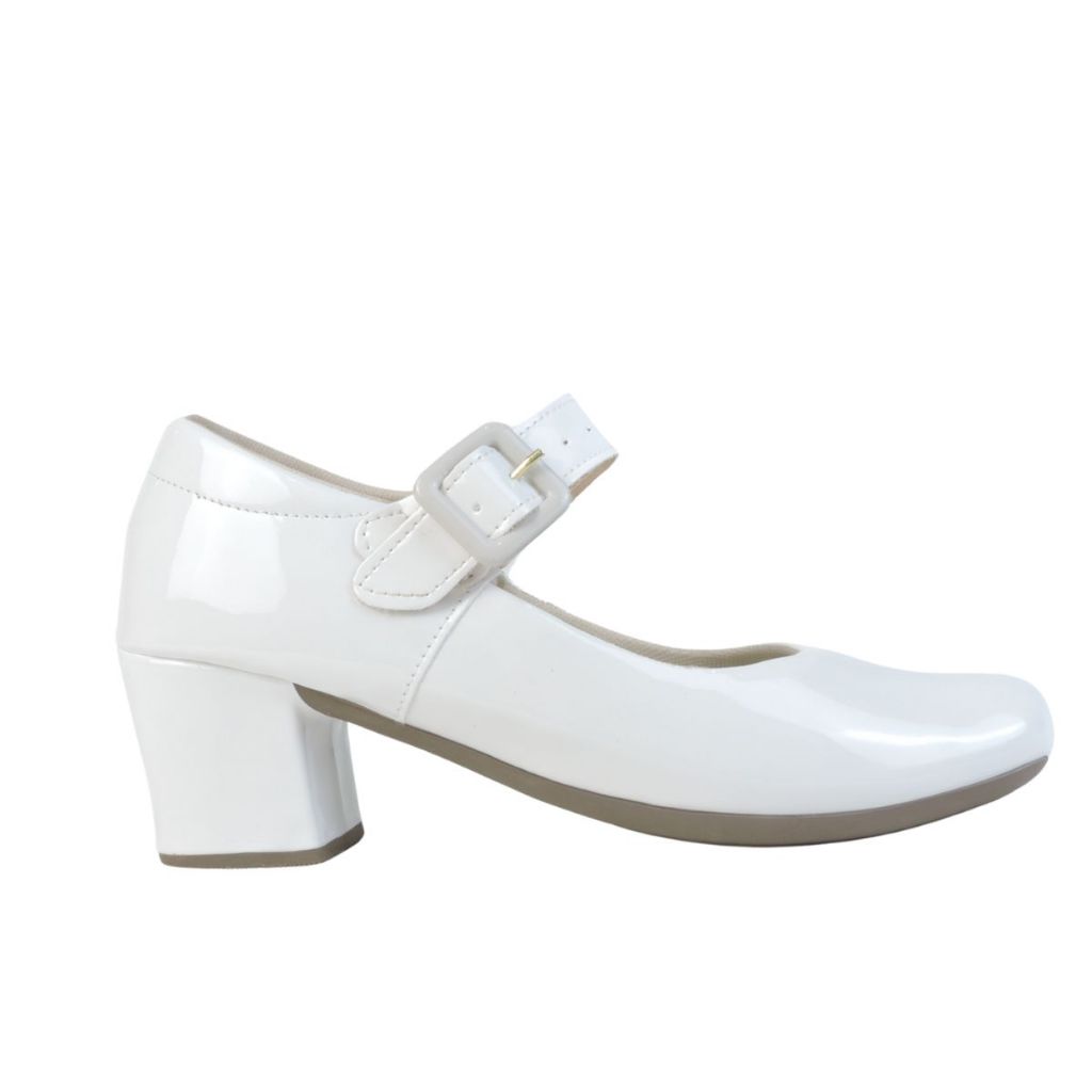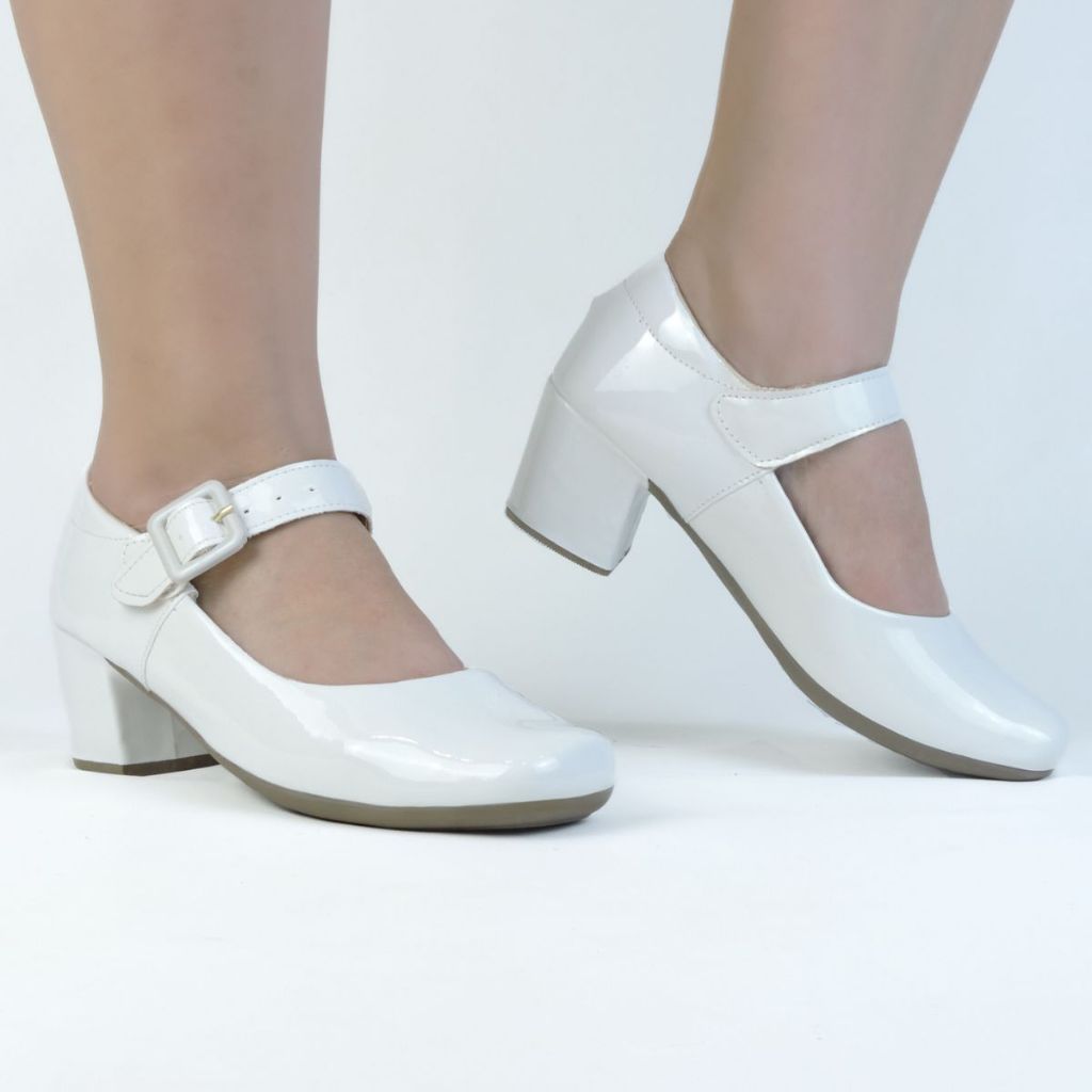 Sapato Social Feminino de Salto Bloco Branco Verniz de Fivela
