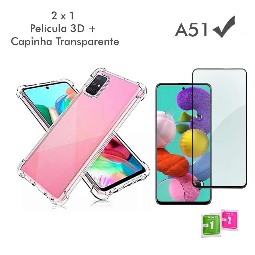 Capa Slim Capa Case Capinha Anti Shock transparente Samsung Galaxy A51+ Película Vidro 3D