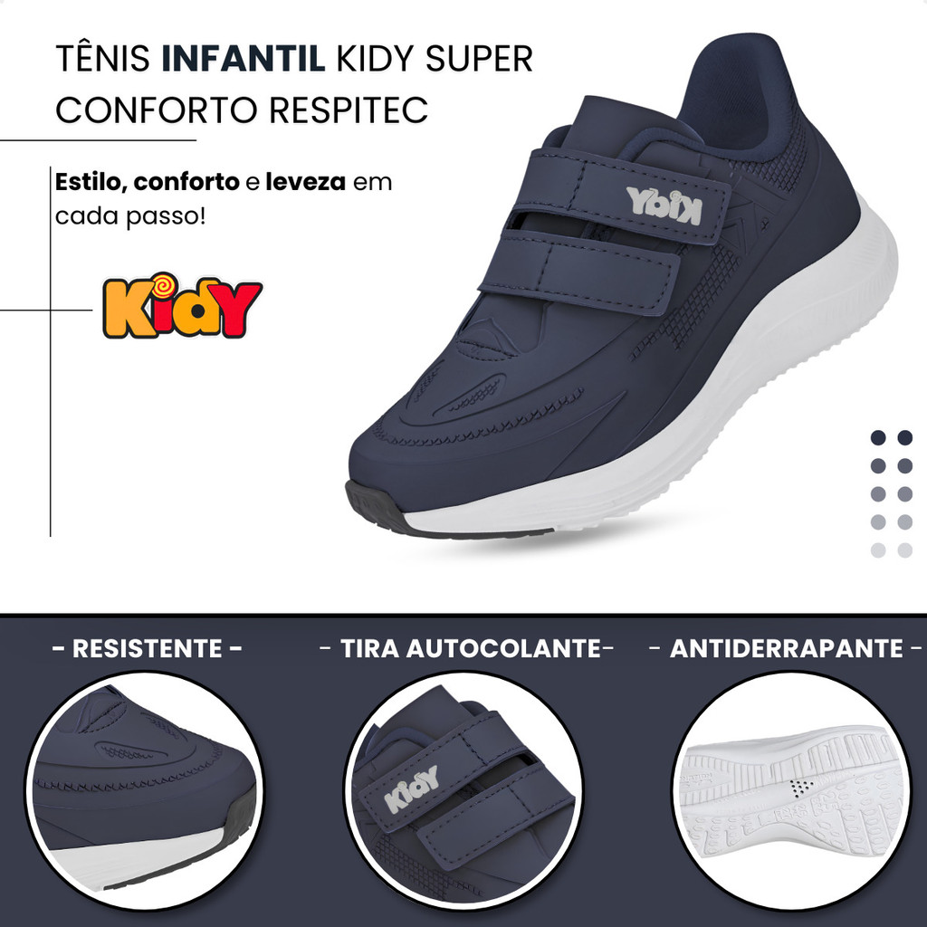 Tênis Infantil Kidy Super Conforto Respitec Tiras Autocolantes Estiloso