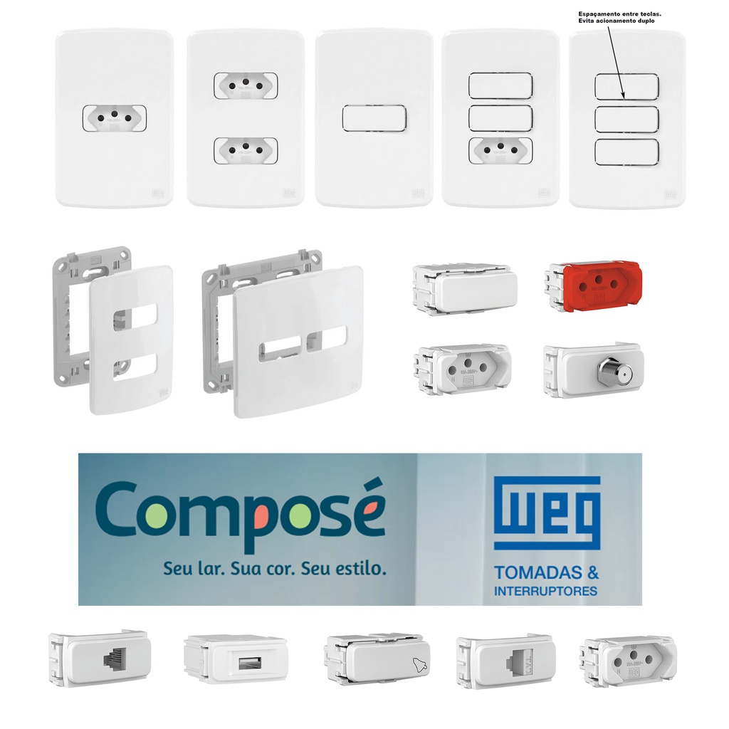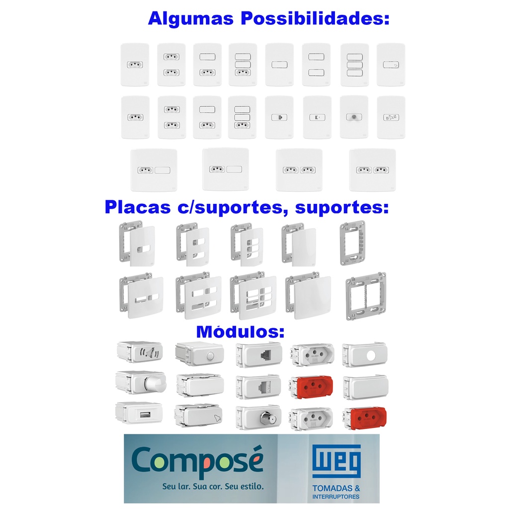 Tomadas 10A teclas placas e interruptores - Weg Composé - Cor Branca - Conjuntos Tomadas, interruptores 4x2 e 4x4 montados e para montar - Módulos Simples ou Paralelo, tomadas 10 e 20 amperes e outros