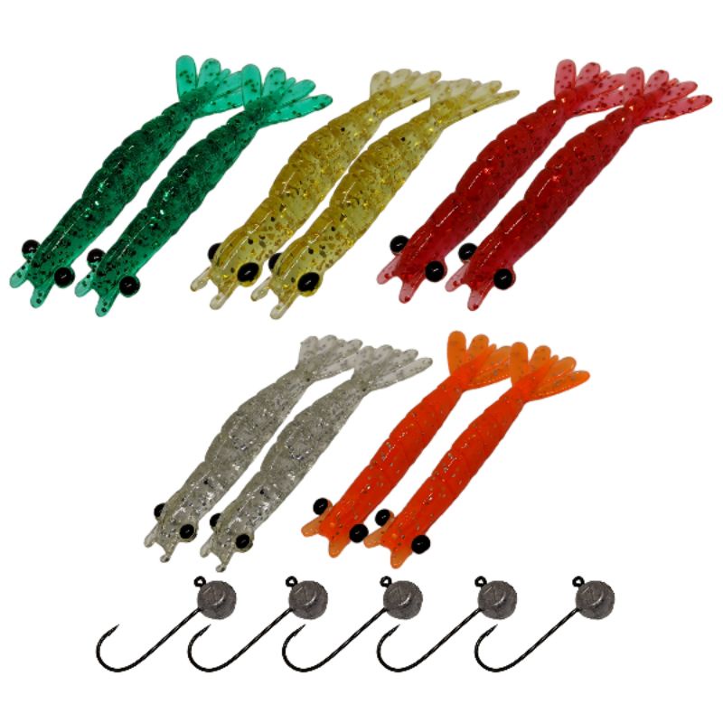 kit Camarão Artificial - 10 Camarões + 5 Jig Head. 15 unidades.