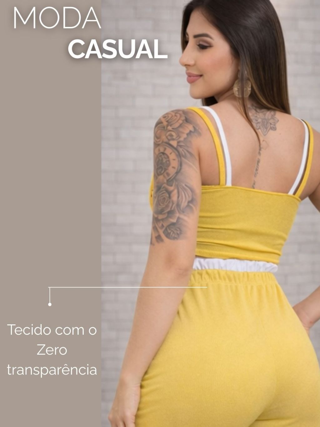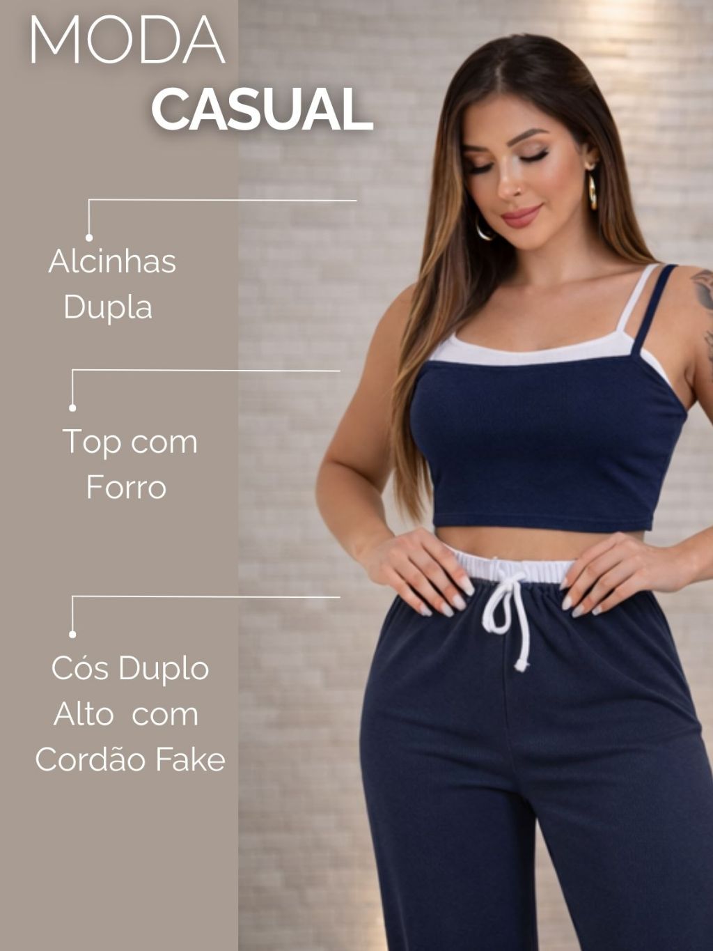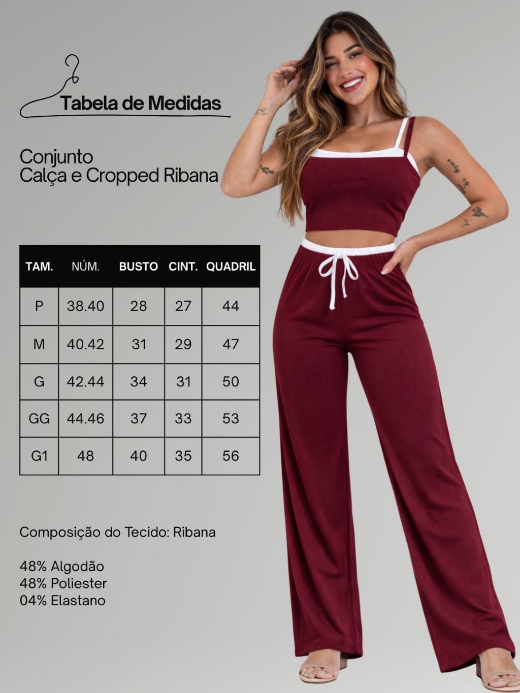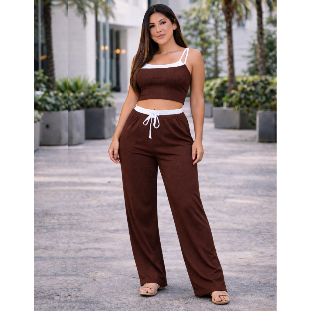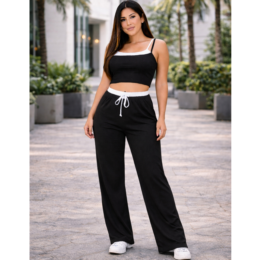 Conjunto Ribana Calça Pantalona cós alto duplo e Top alcinhas dupla P ao G1