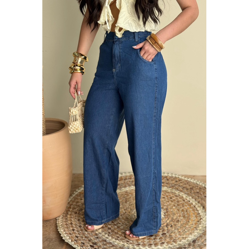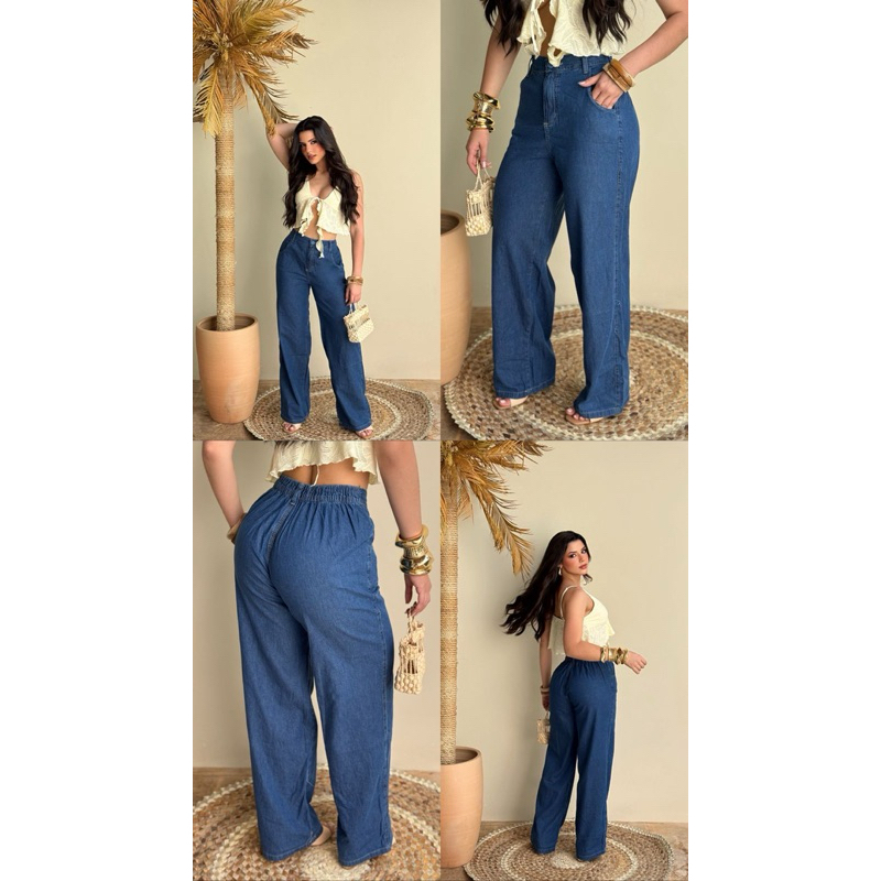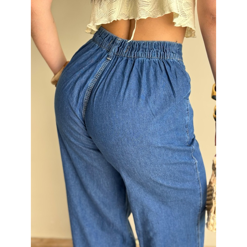 PANTALONA CALÇA FEMININA WIDE LEG JEANS MEDIO CINTURA ALTA COM ELASTICO E COS