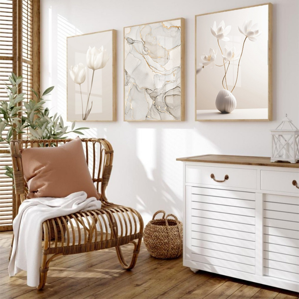 Trio de Quadro Flores Tons de Bege Abstrato com Vidro