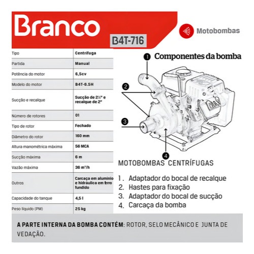 Motobomba a Gasolina Branco B4T-716 6,5CV Alta Pressão 36.000 L/h - Centrífuga 56 MCA com Alerta