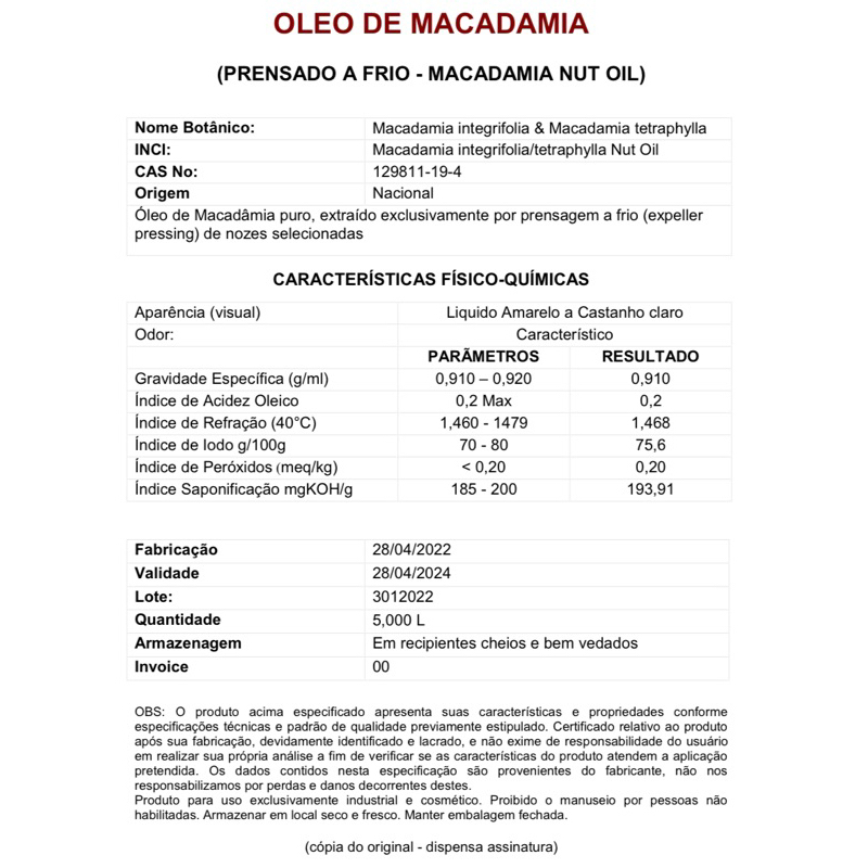 Óleo Vegetal Macadâmia (Prensado à Frio)