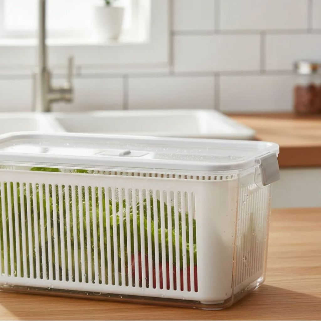 Pote Hermético Slim Organizador Geladeira com Cesto Drenagem - Saladas Frutas Legumes Empilhável