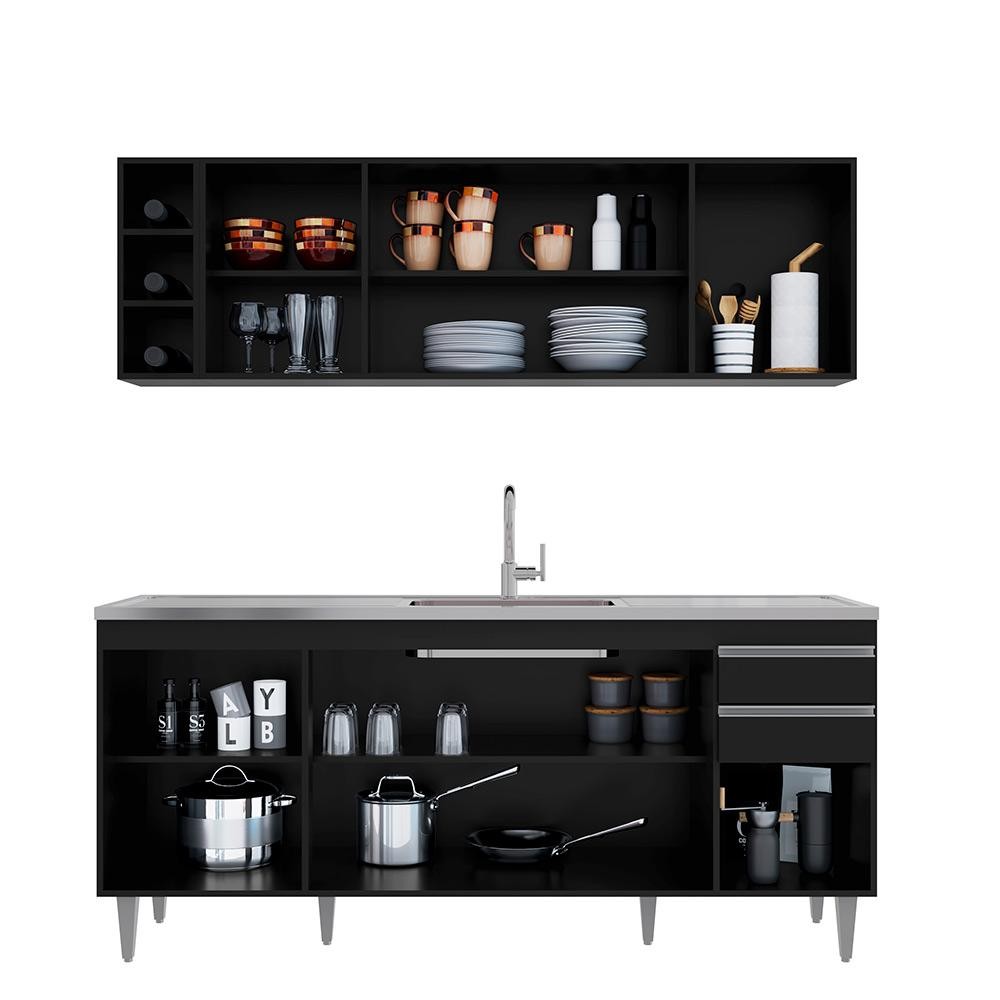 Conjunto Balcão de Cozinha para Pia Apex Armário Aéreo MDP/BP Preto G96 - Gran Belo