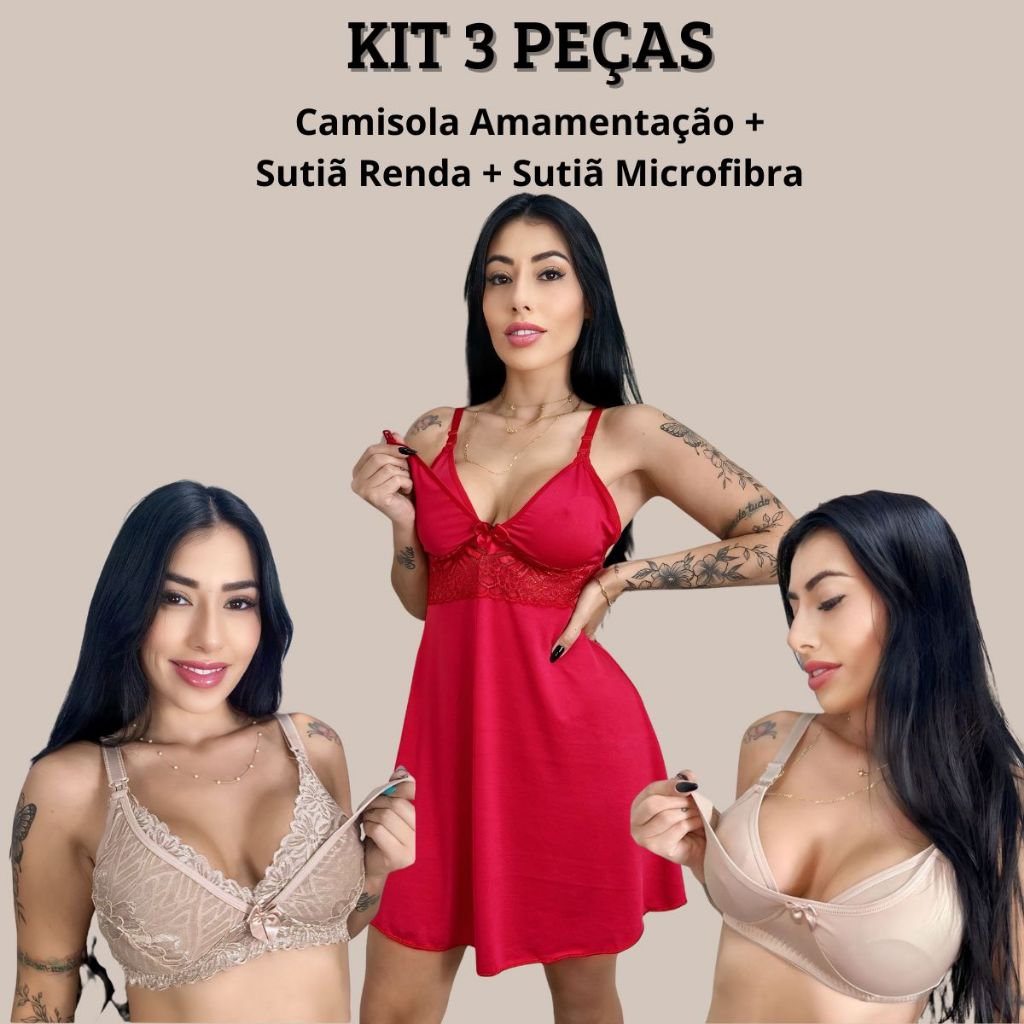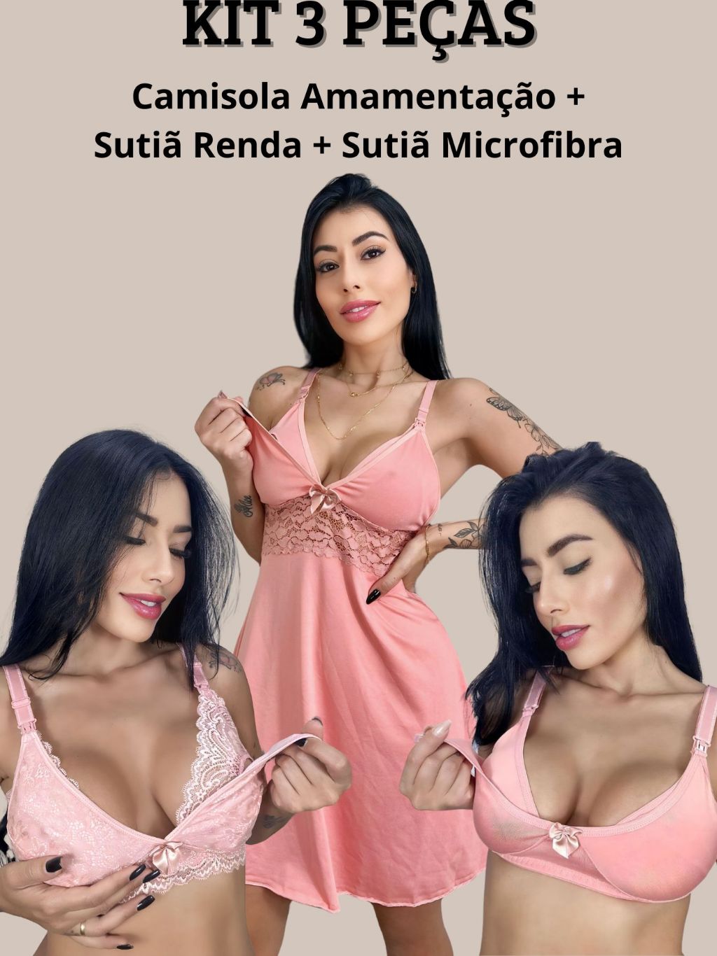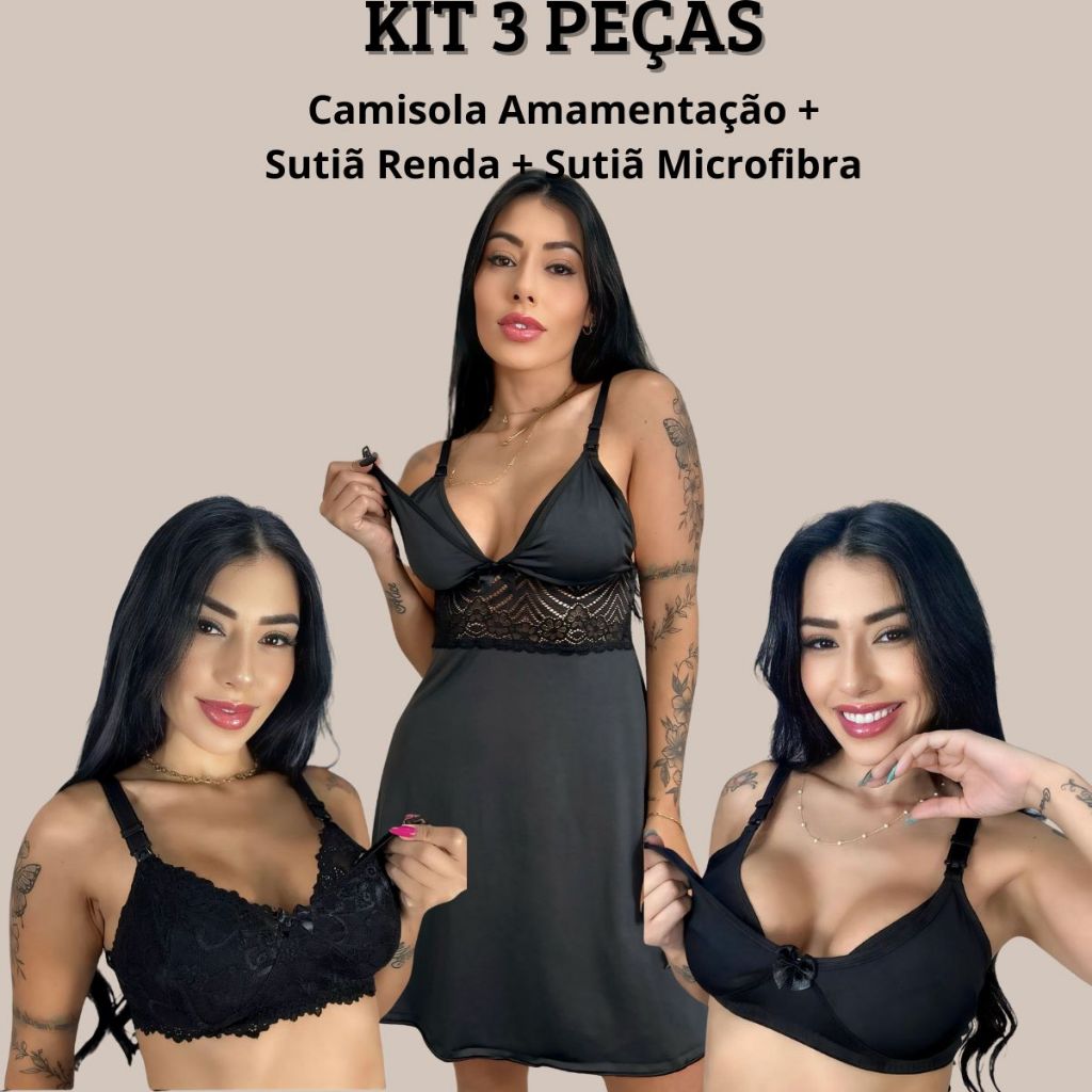KIT Amamentação 3 Peças Camisola Com Detalhes em Renda + Sutiã MICROFIBRA + Sutiã RENDA.