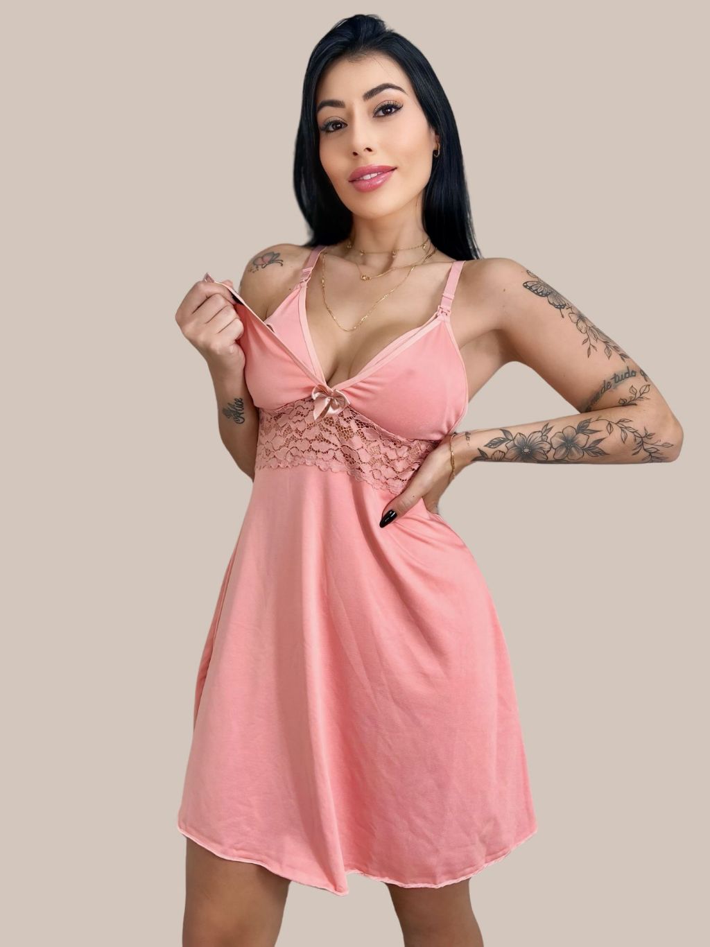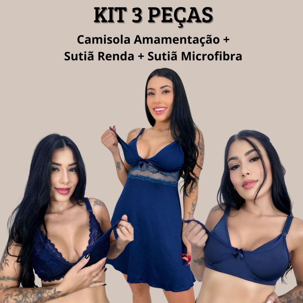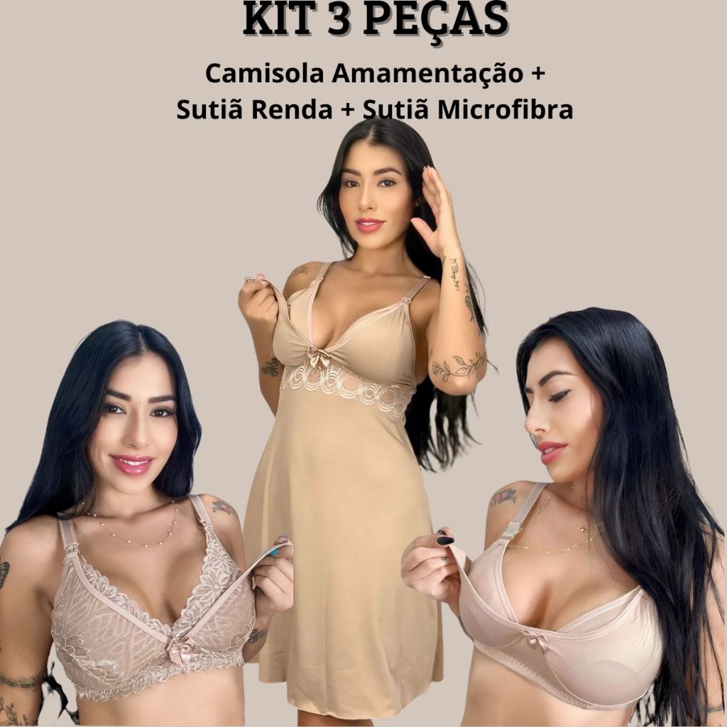 KIT Amamentação 3 Peças Camisola Com Detalhes em Renda + Sutiã MICROFIBRA + Sutiã RENDA.