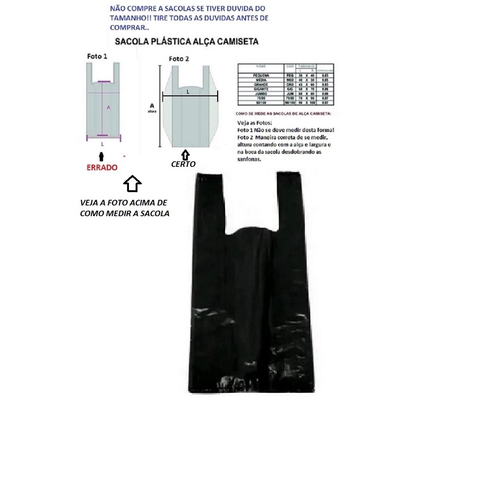 Sacola Plastica Preta Reforçada Alça Camiseta da 25x35 a 50x70 Pacote de 1 kg