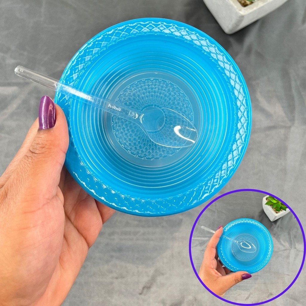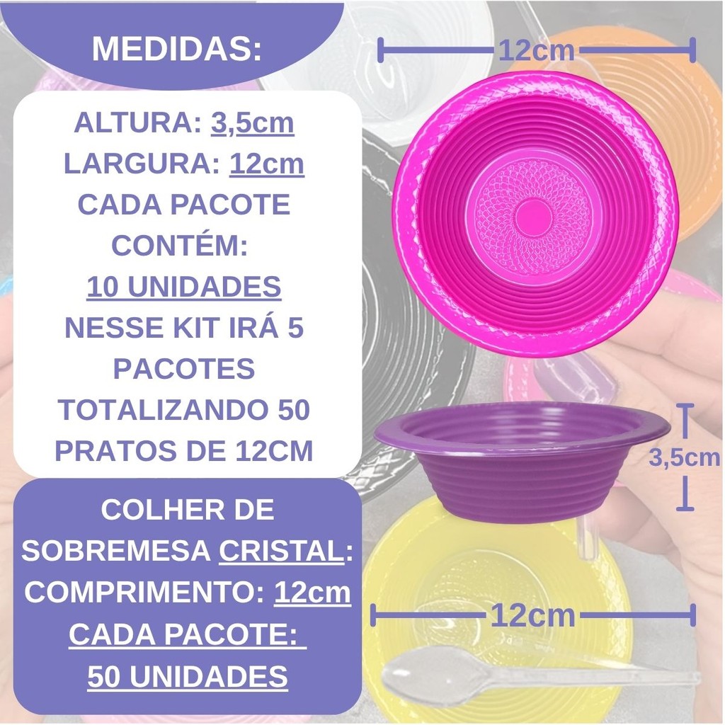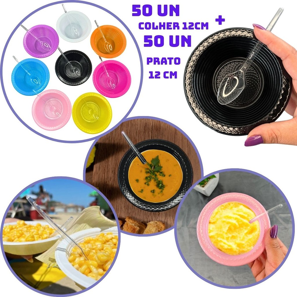 Kit 50 Prato Descartável Fundo Colorido Cumbuca 12cm + Colher 50 Cristal Petisco Festa Bolo Aniversario Milho