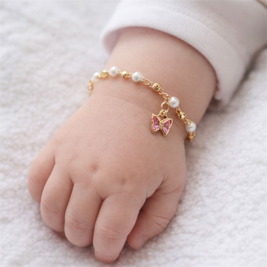 Kit Bebê 2 Pulseiras de Bolinha e Pérolas Semijoias Antialérgico Banhado a Ouro 18k kit meninas bebê
