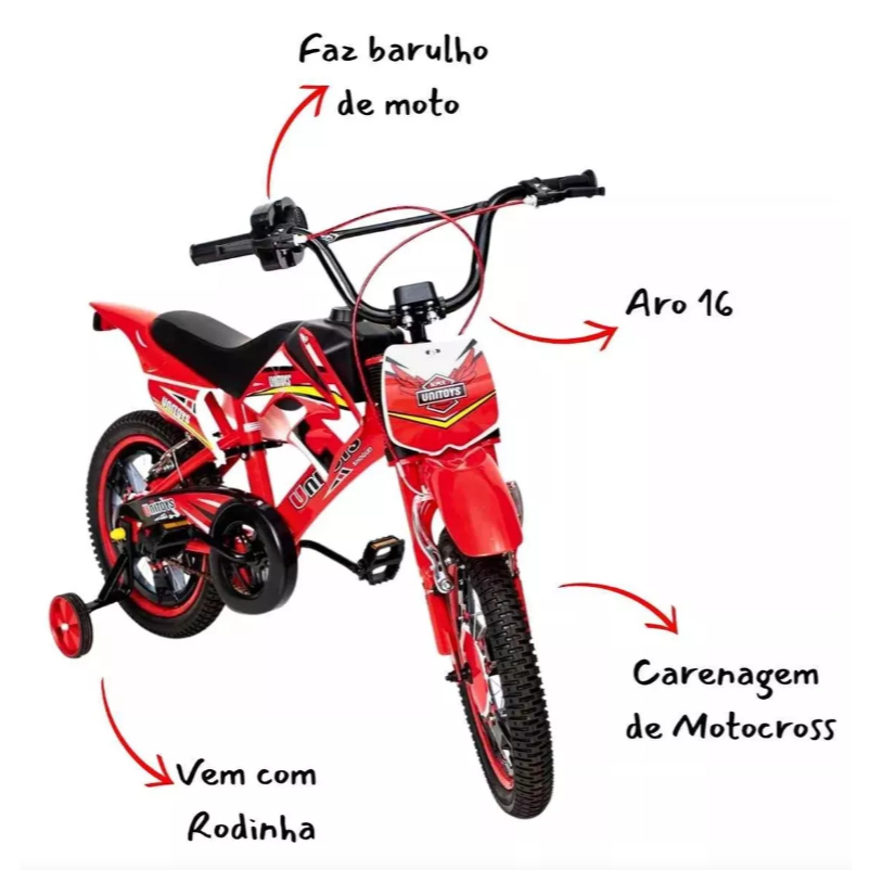 Bicicleta Infantil Moto Cross Aro 16 Vermelha - Unitoys imita barulho moto
