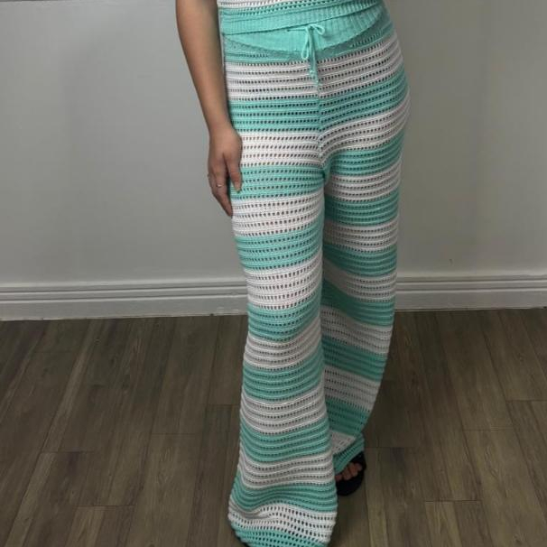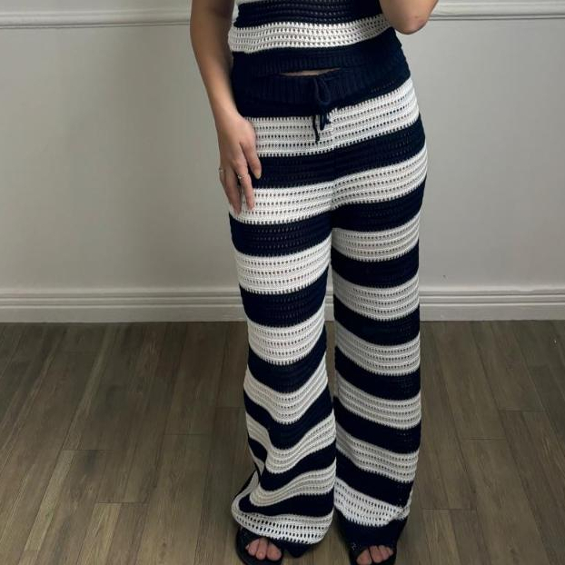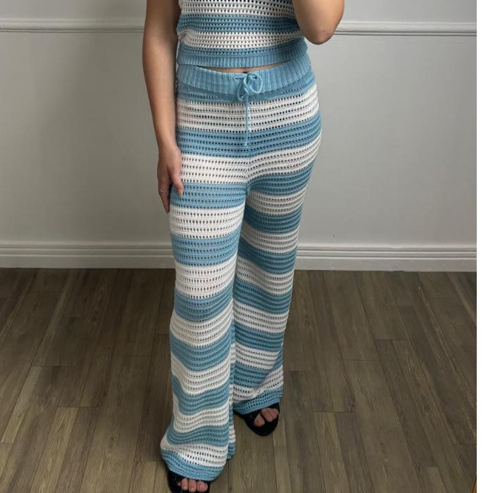 Saida De Praia Calça Pantalona Com Cordão Listrada Croche Moda Verao Blogueira Luxo Trico Tricot Moda Feminina Verão