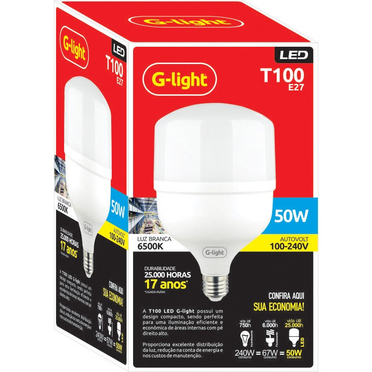 Lâmpada Led T100 50w 6500k 4000lm Bocal E27 - G-light Cor da luz Branco-frio 110V/220V