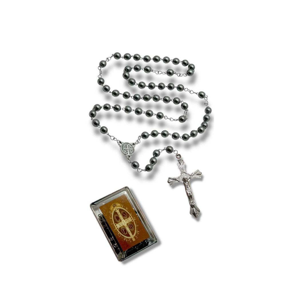 Terço Hematita São Bento Medalha Com Caixa 49cm