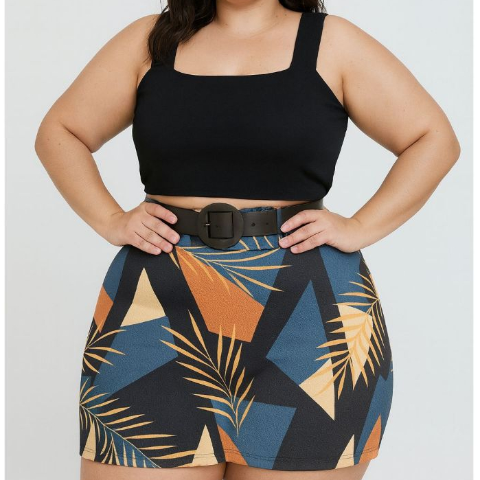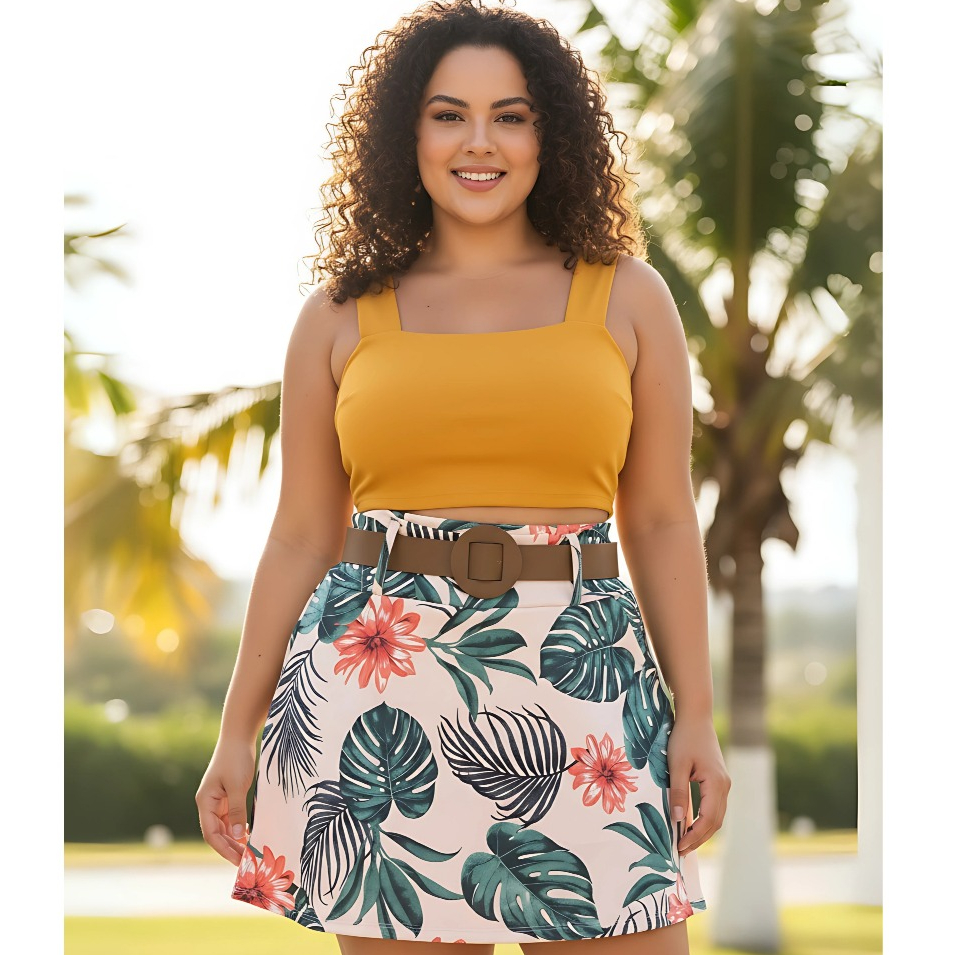 Conjunto Feminino Blusa Cropped + Short Saia com Cinto Plus Size - Conjuntinho Plus Curve