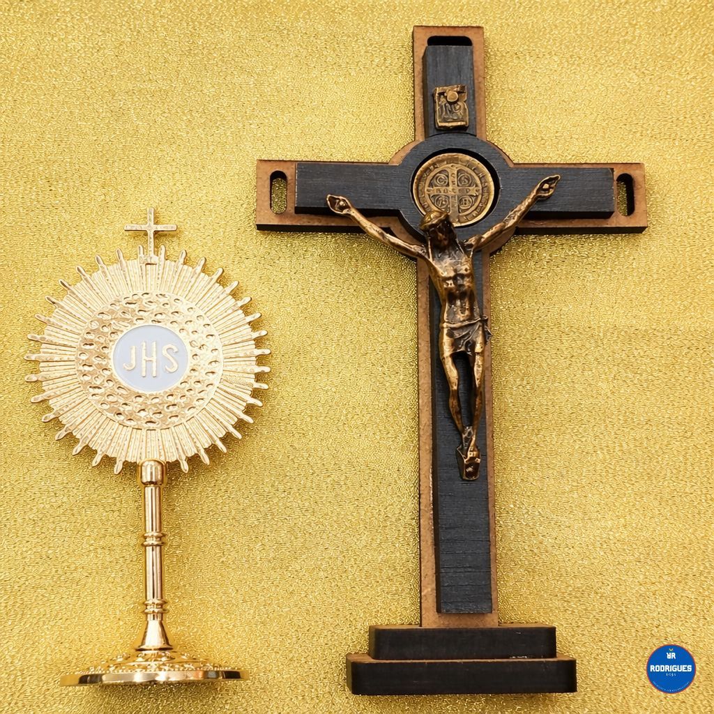 Kit Religioso Ostensório 10cm + Crucifixo São Bento 15cm Madeira Proteção Fé