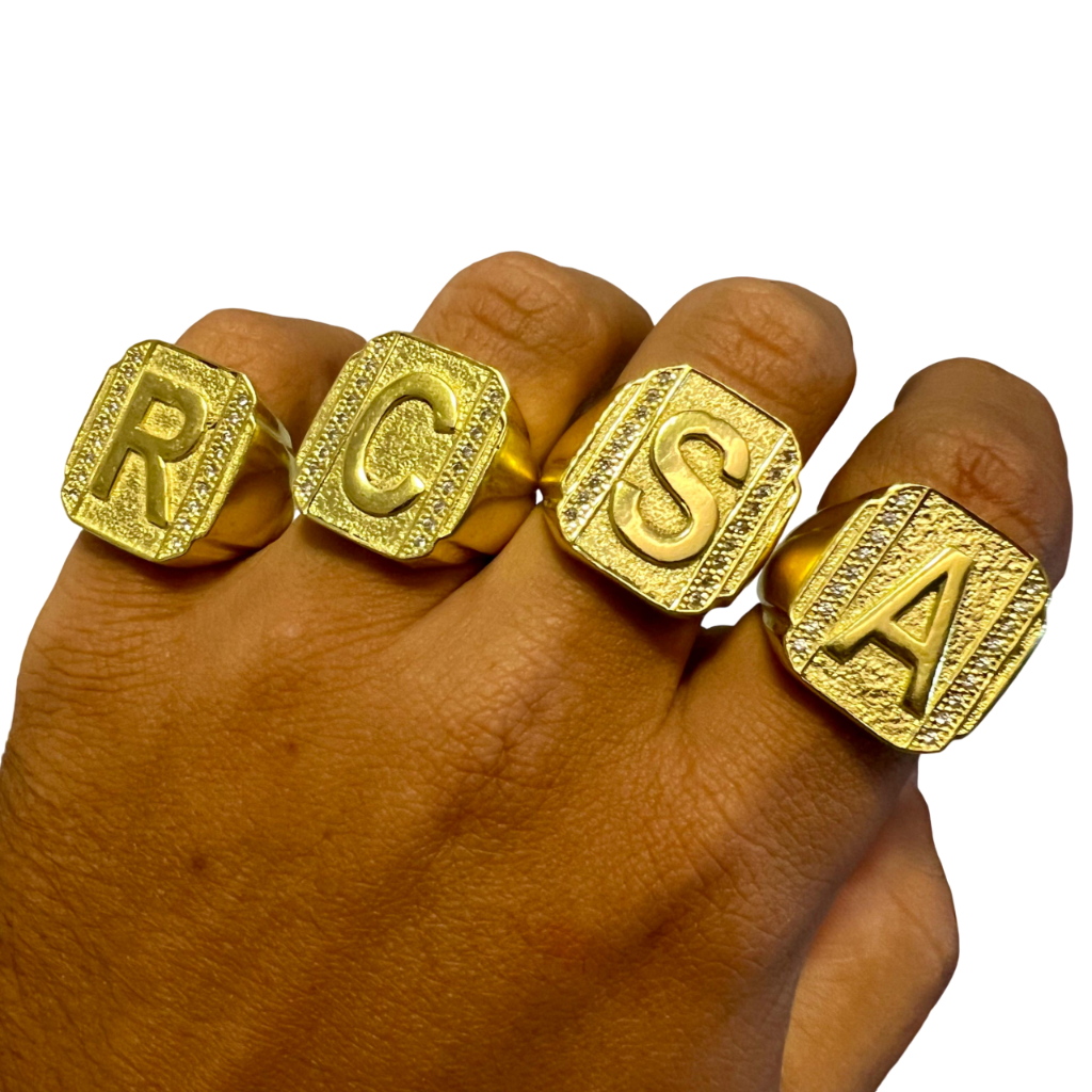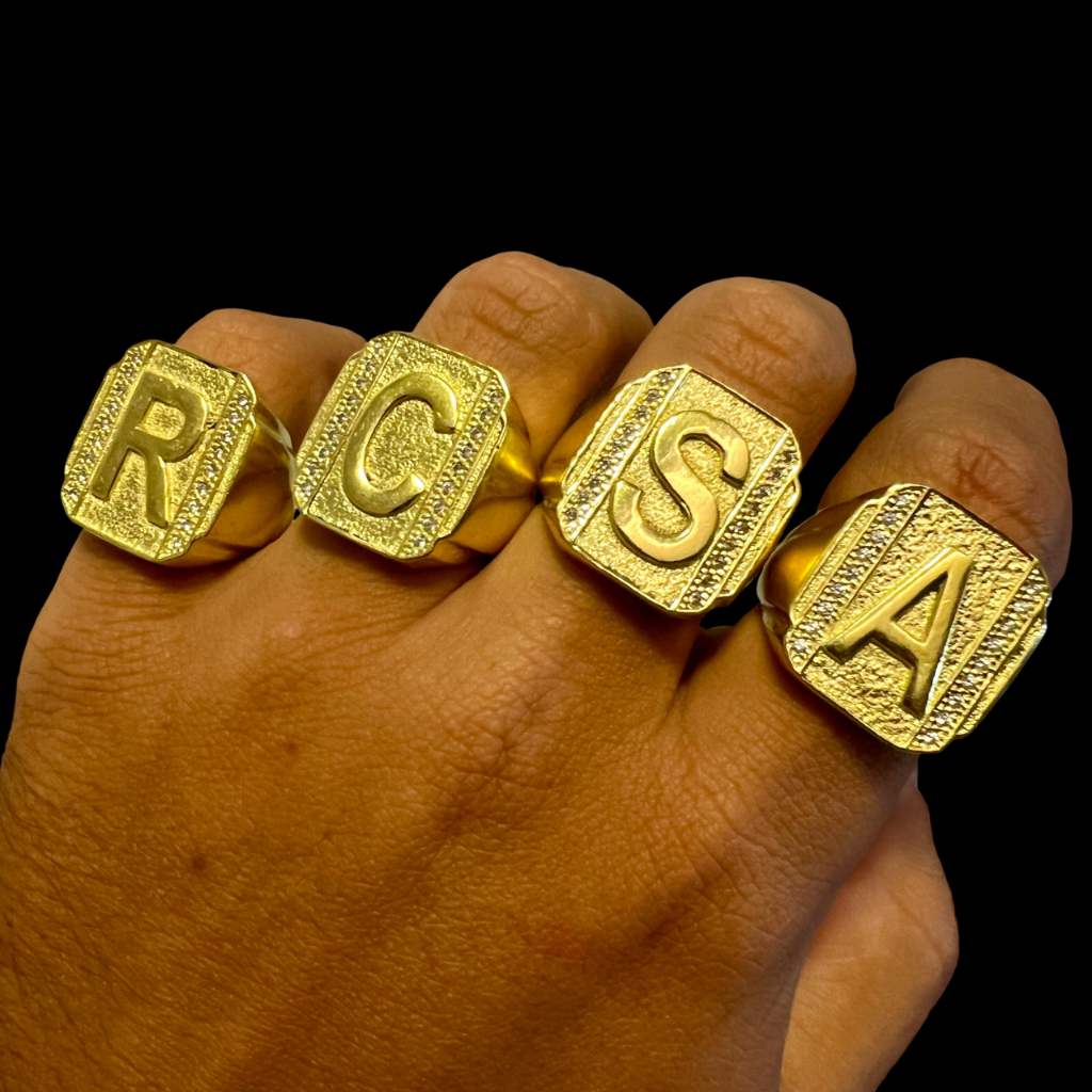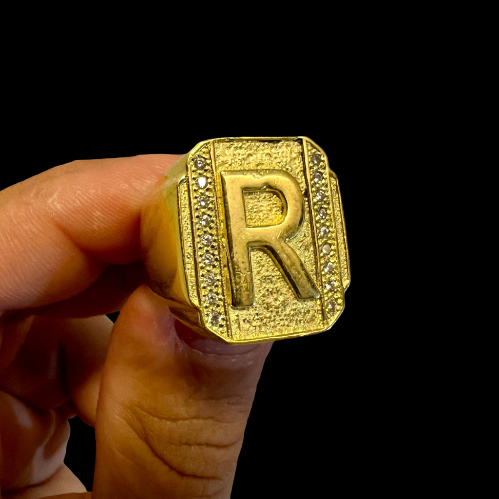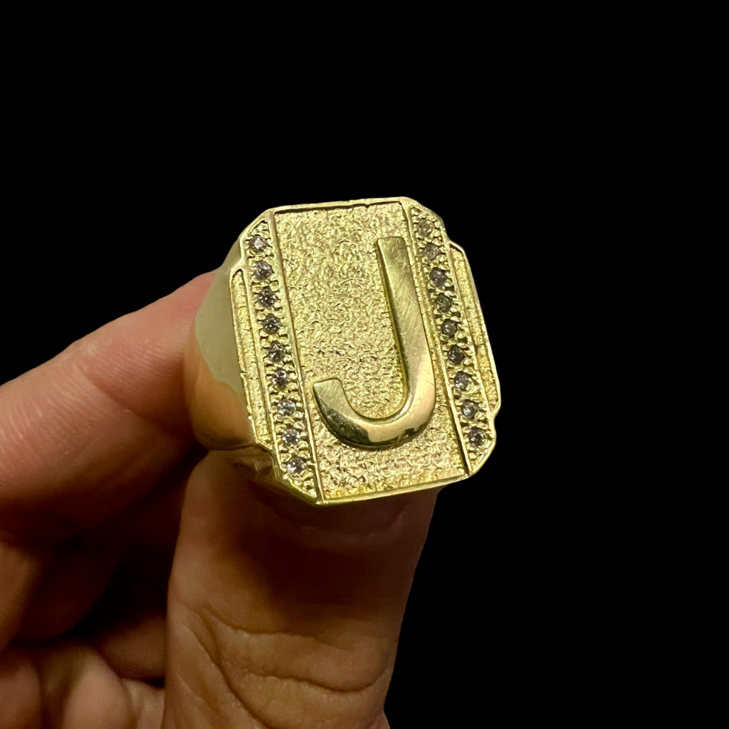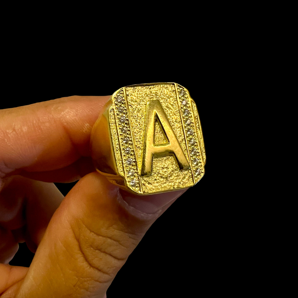ANEL DEDEIRA INICIAL NOME MOEDA ANTIGA LETRA ALFABETO CRAVEJADO COR OURO 18K