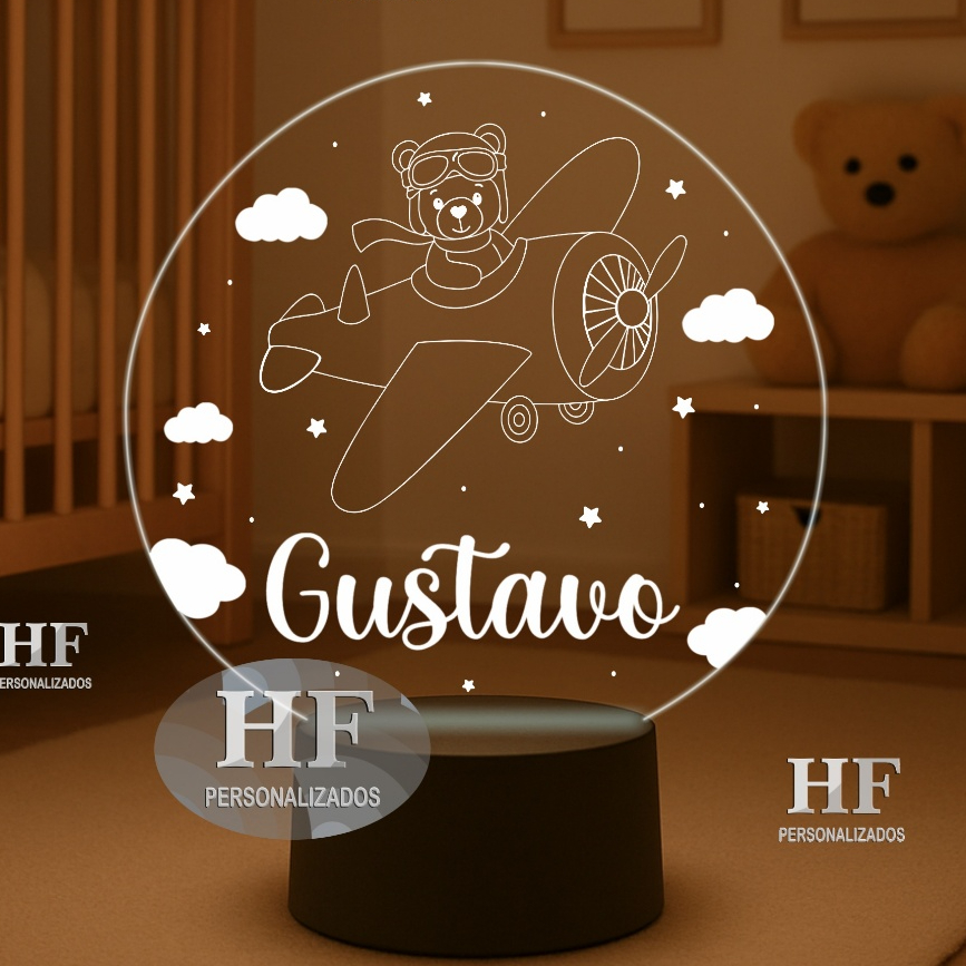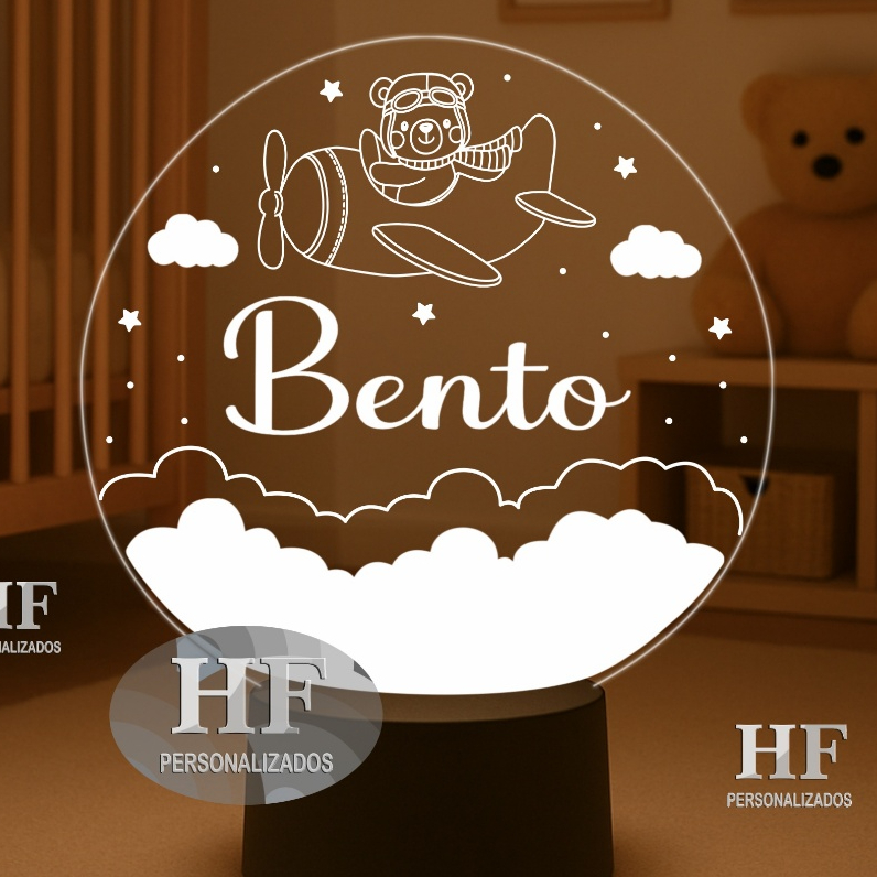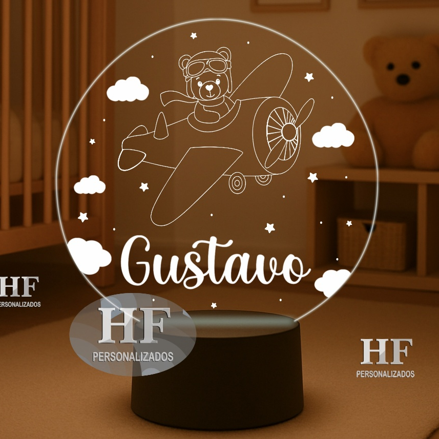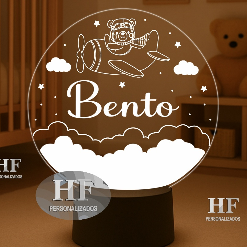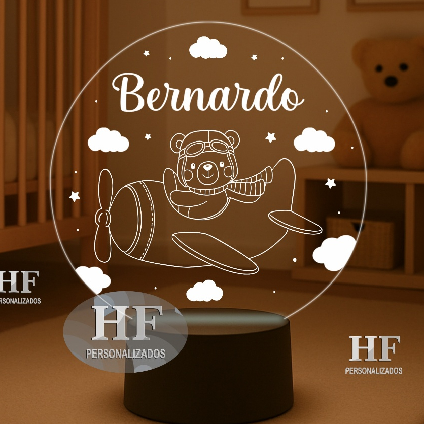 Luminária LED Urso aviador, ursinho aviador, nuvens - Abajur Personalizado. Nome Personalizado!