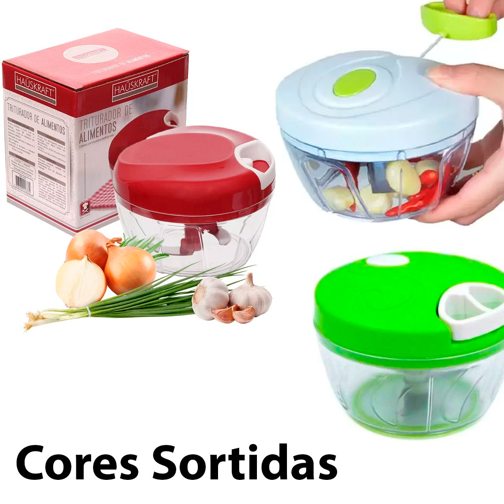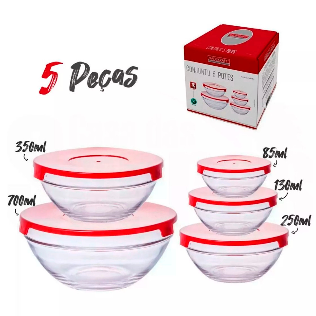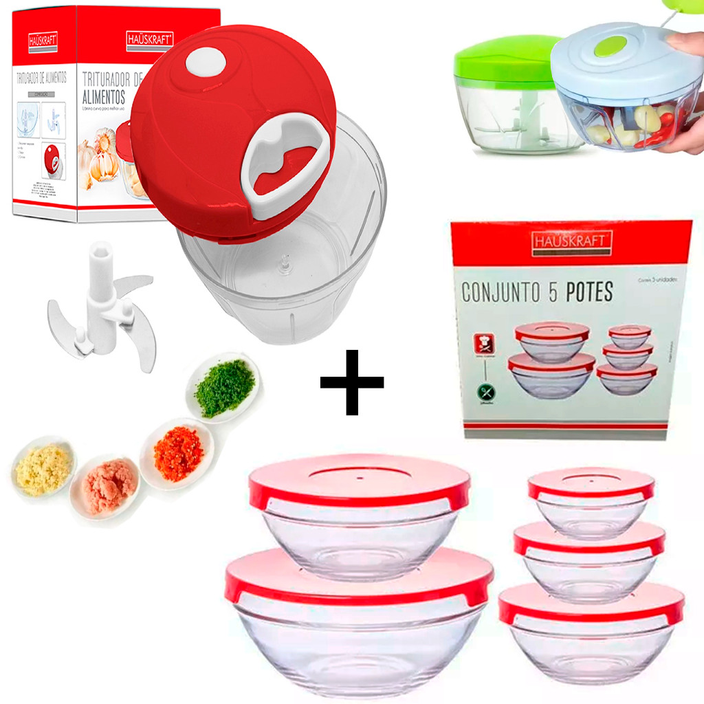 Kit Jogo Cozinha 5 Potes Redondos De Vidro Com Tampa + Triturador De Alimentos Manual 500ml Prático