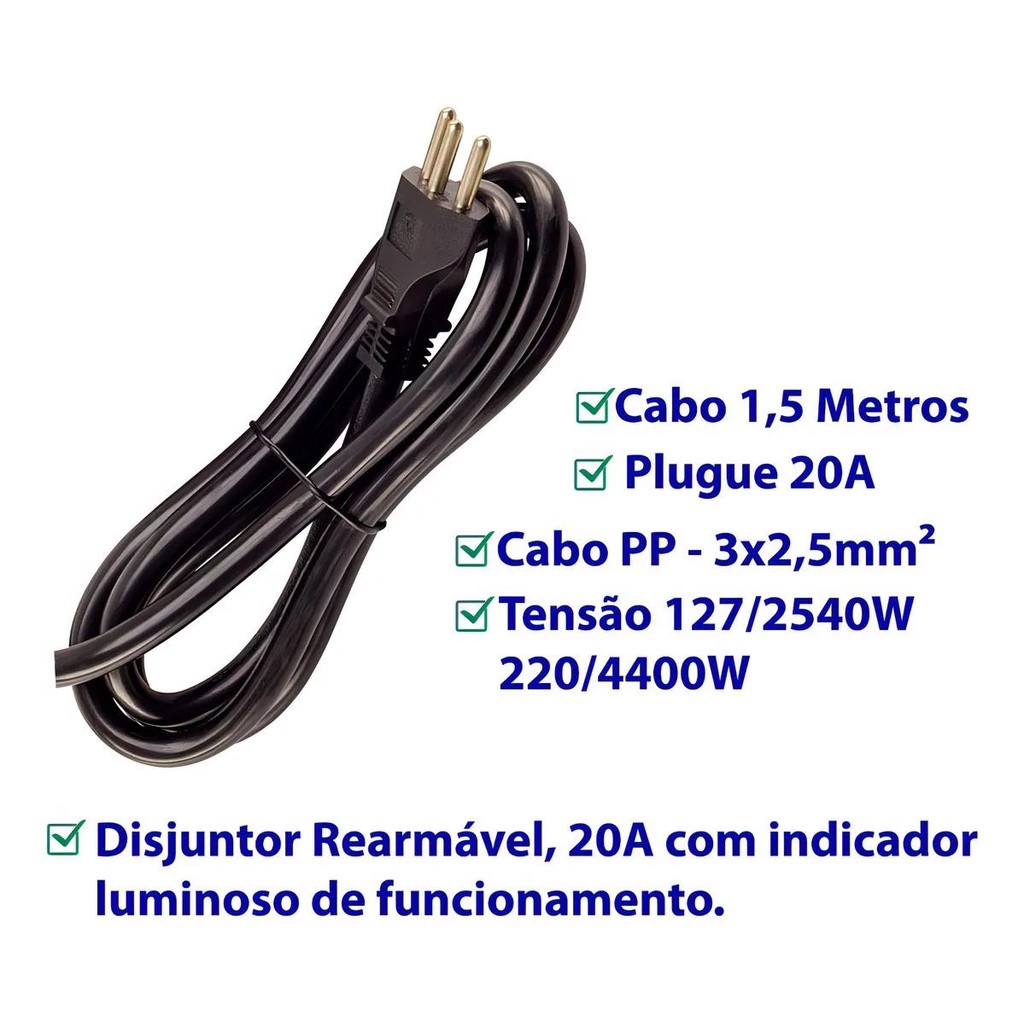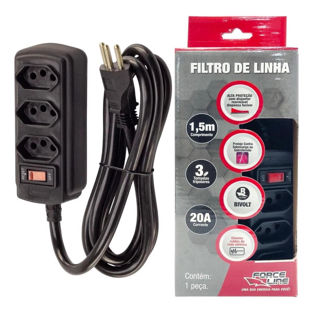 Filtro de Linha 20A 3 Tomadas Preto Cabo 1,50m Force Line Extensão Elétrica Energia Várias Tomadas