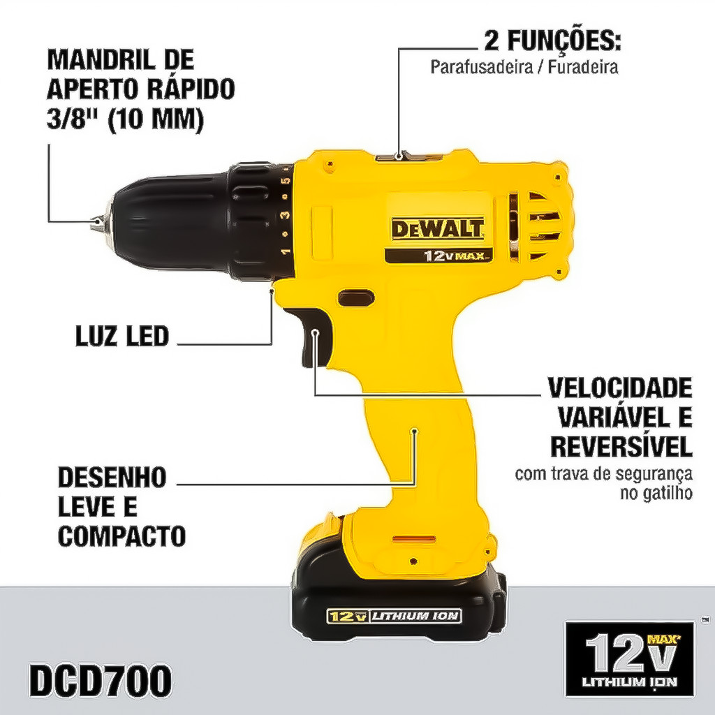 Furadeira Parafusadeira Bateria 12v 2VVR 3/8Pol. Reversível LED Marcenaria Eletricista Móveis DEWALT