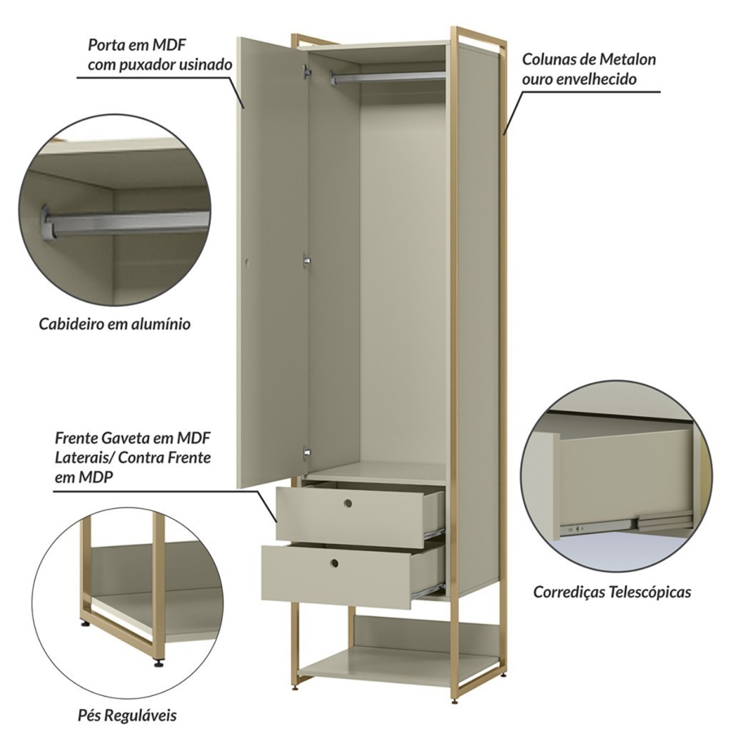 Guarda Roupa Modulado Closet Industrial c/ Porta 2 Gavetas 54cm Off White - Olivar Móveis