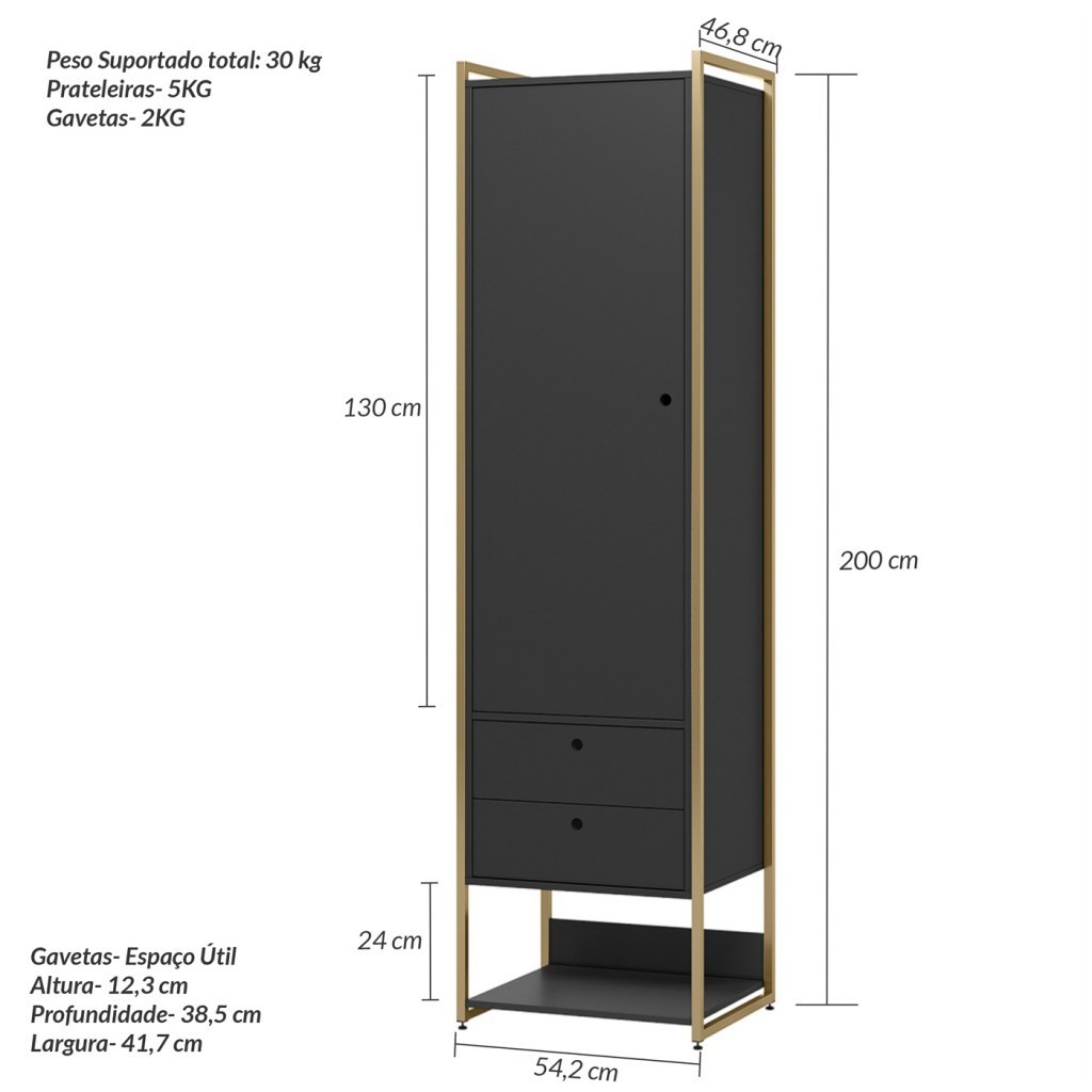 Guarda Roupa Modulado Closet Industrial c/Porta Gavetas 54cm Preto - Olivar Móveis
